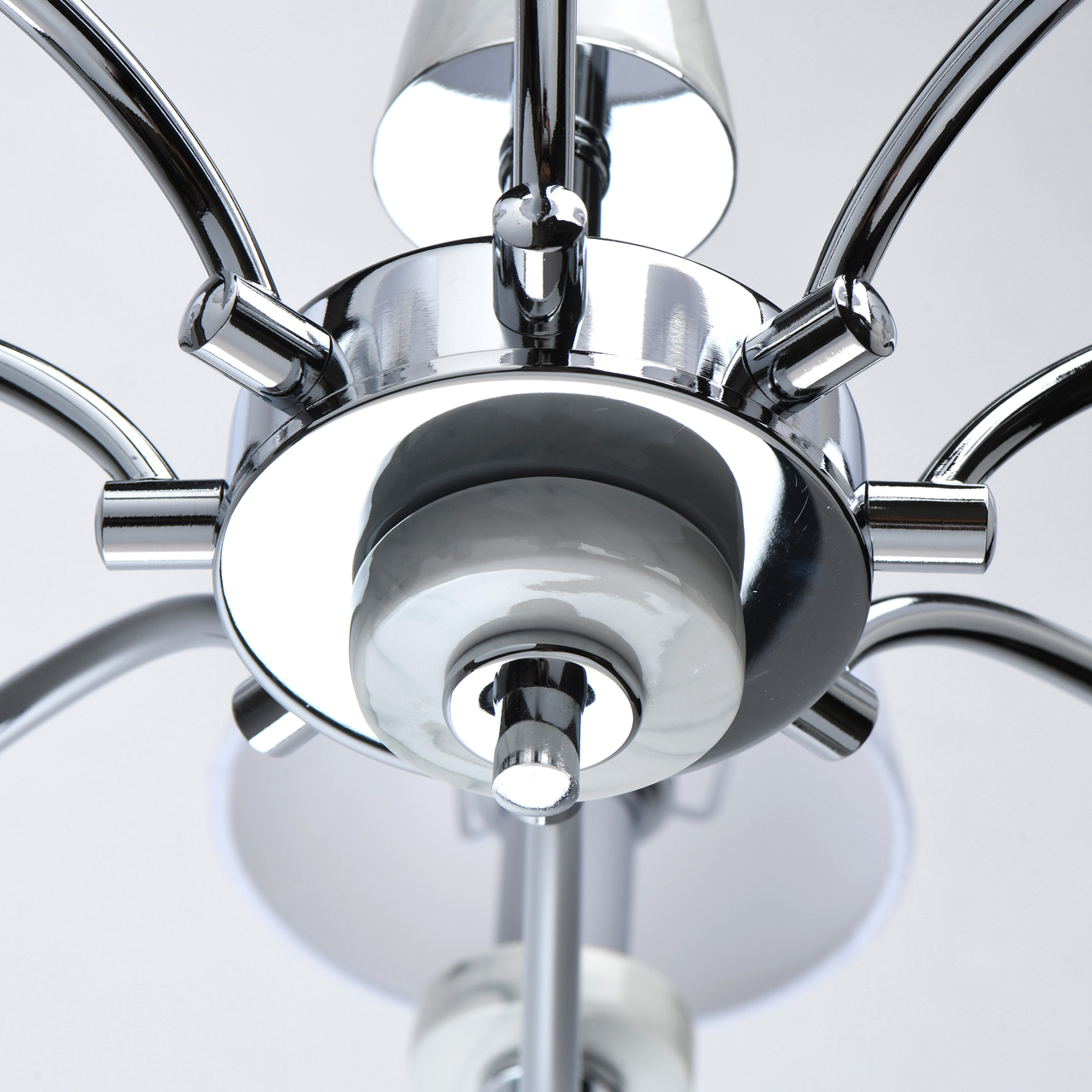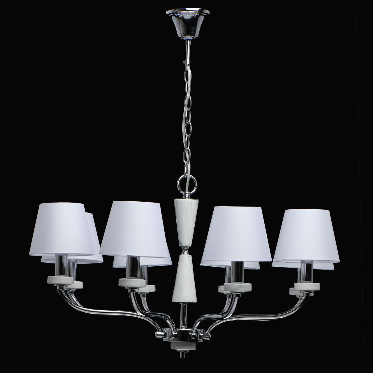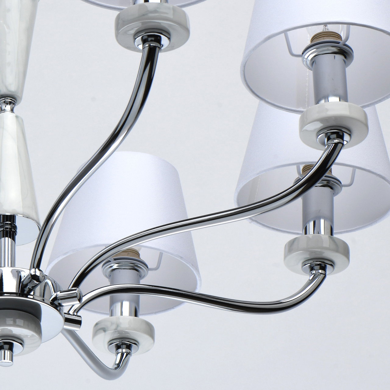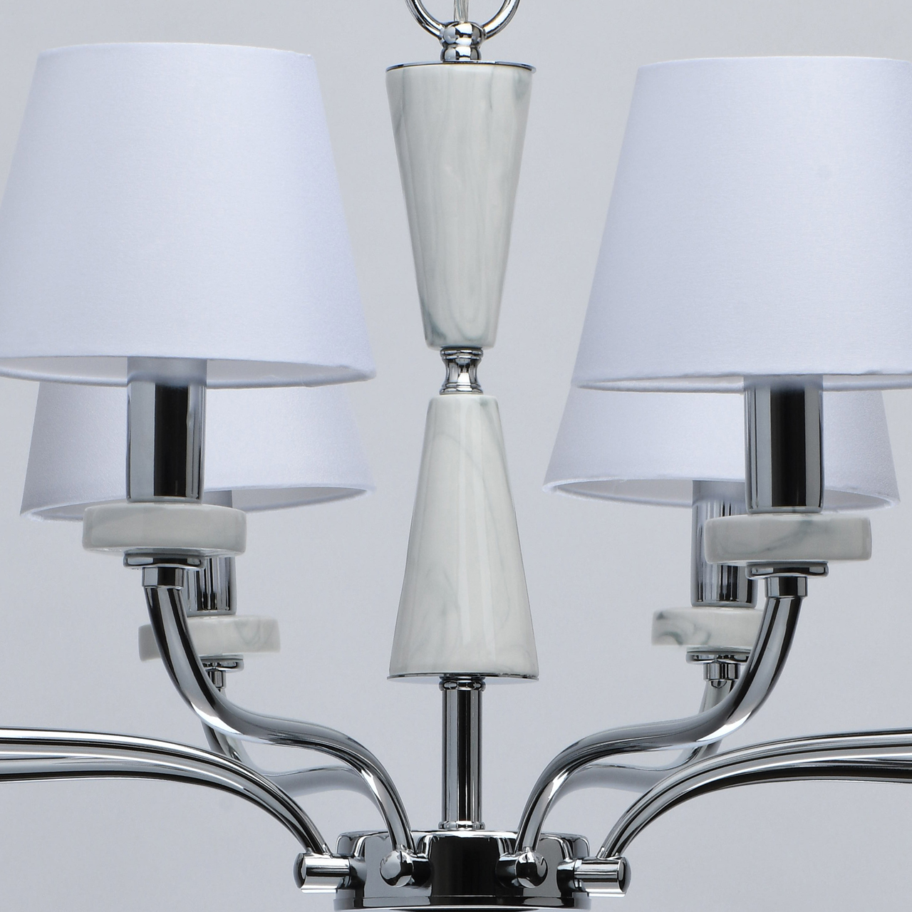 Основание светильника выполнено из металла и гальванизировано в цвет хрома. Светильник декорирован белыми текстильными абажурами с термостойким акрилом внутри. Абажуры прошиты и отделаны кантом. Декоративные розетки и декор центральной оси выполнены из глазурированного фарфора с надглазурной росписью, имитирующей мрамор.Тип помещения