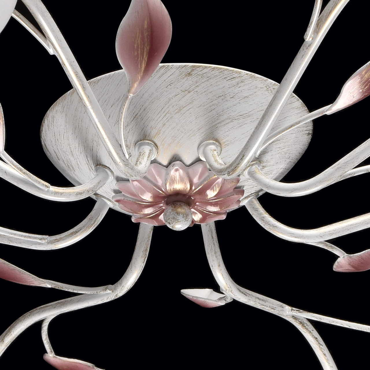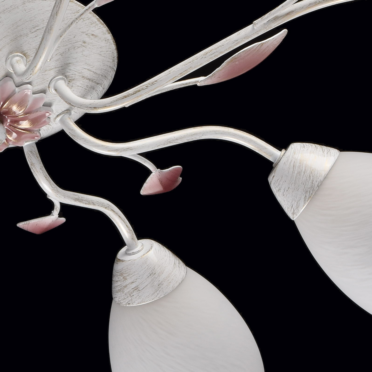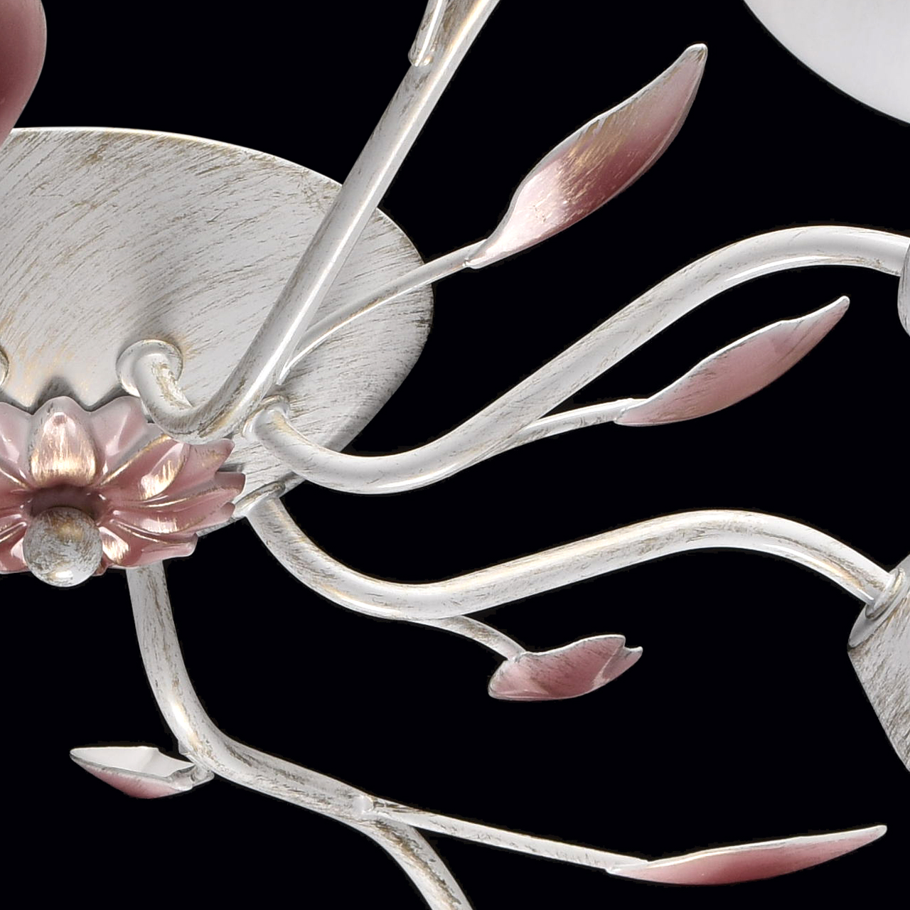 Основание: металл, окрашивание по технологии хай-лайт, основной цвет - белый, декоративный слой цвета золота. Рожки выполнены прокатом на роликовом станке. Декор: растительные элементы из металла, выполнены по технологии прессования, градуировано окрашены в розовый цвет. Плафоны: алебастровое стекло, матирование.Тип помещения