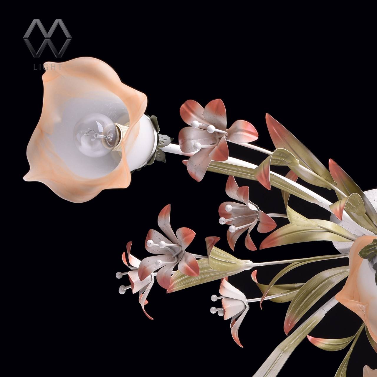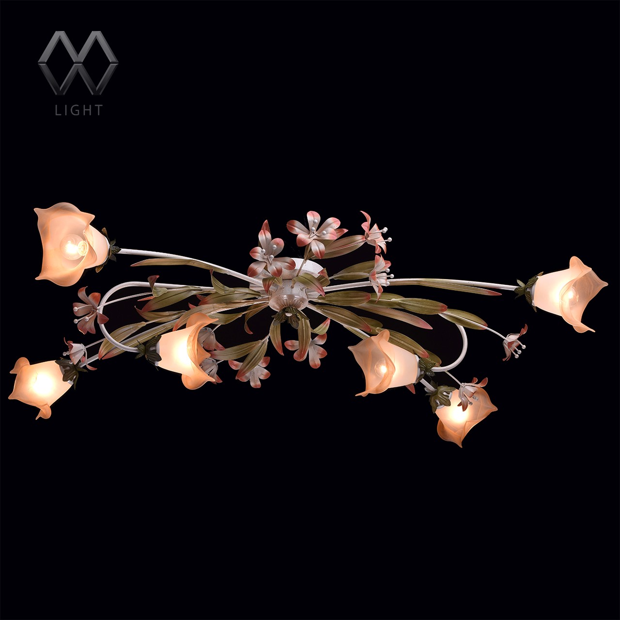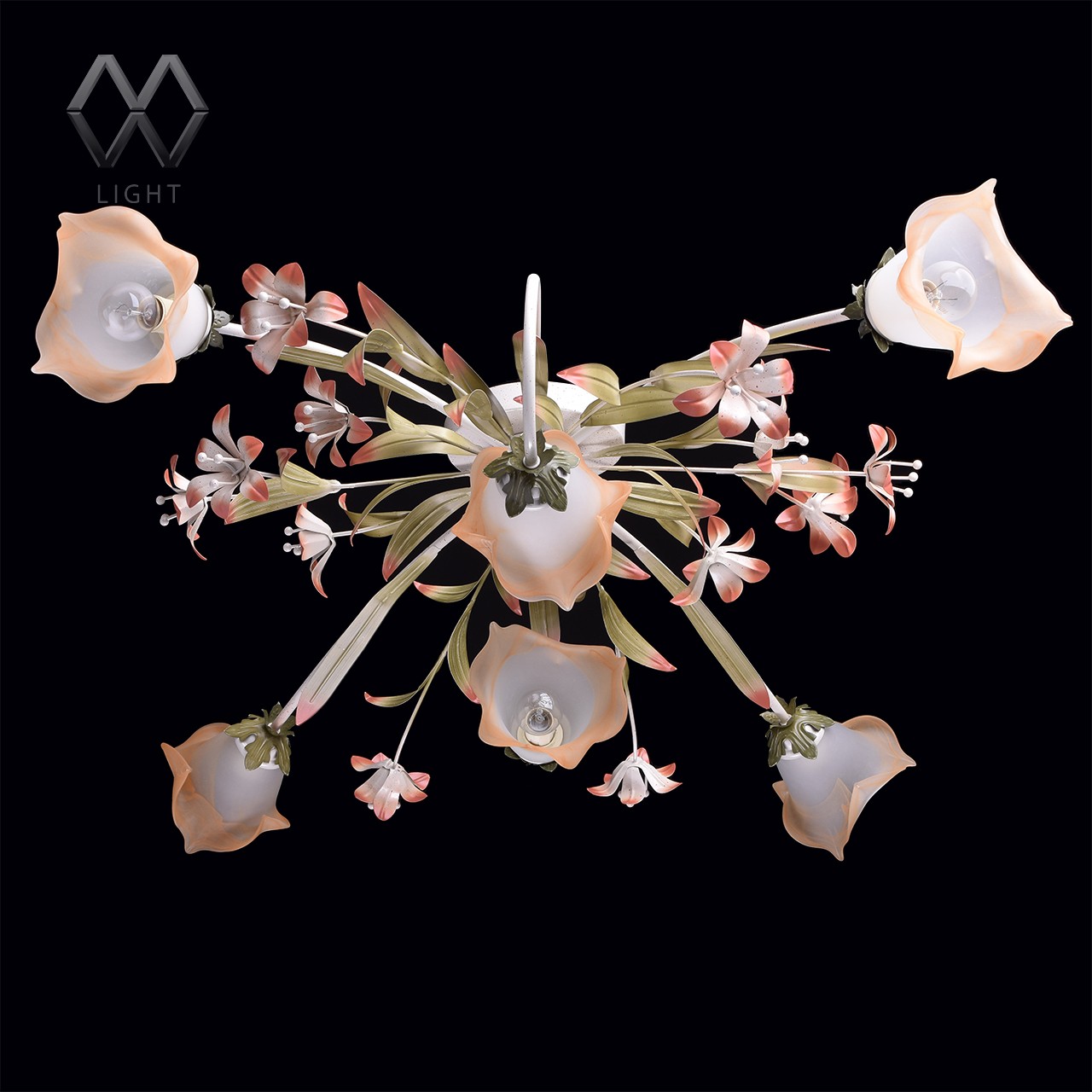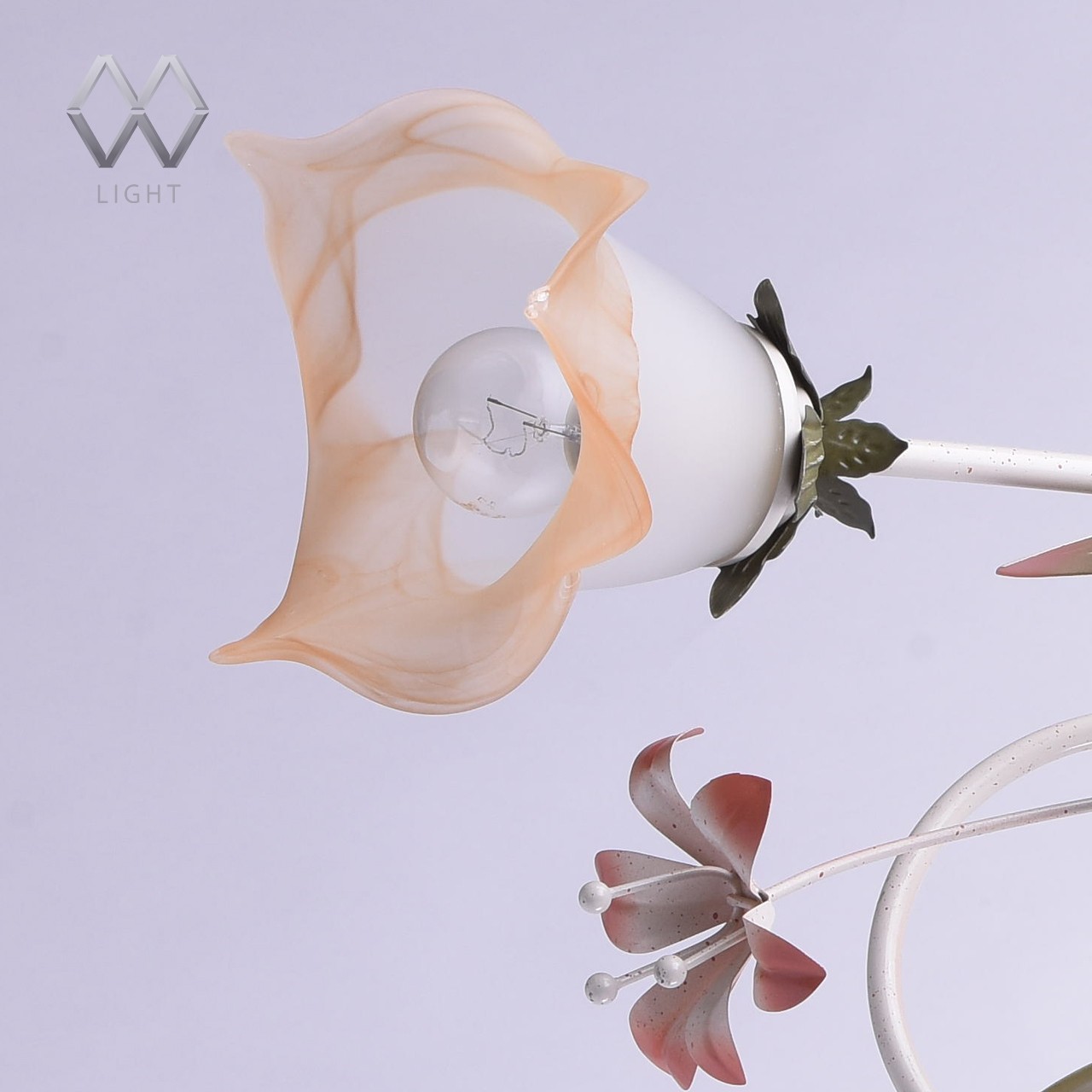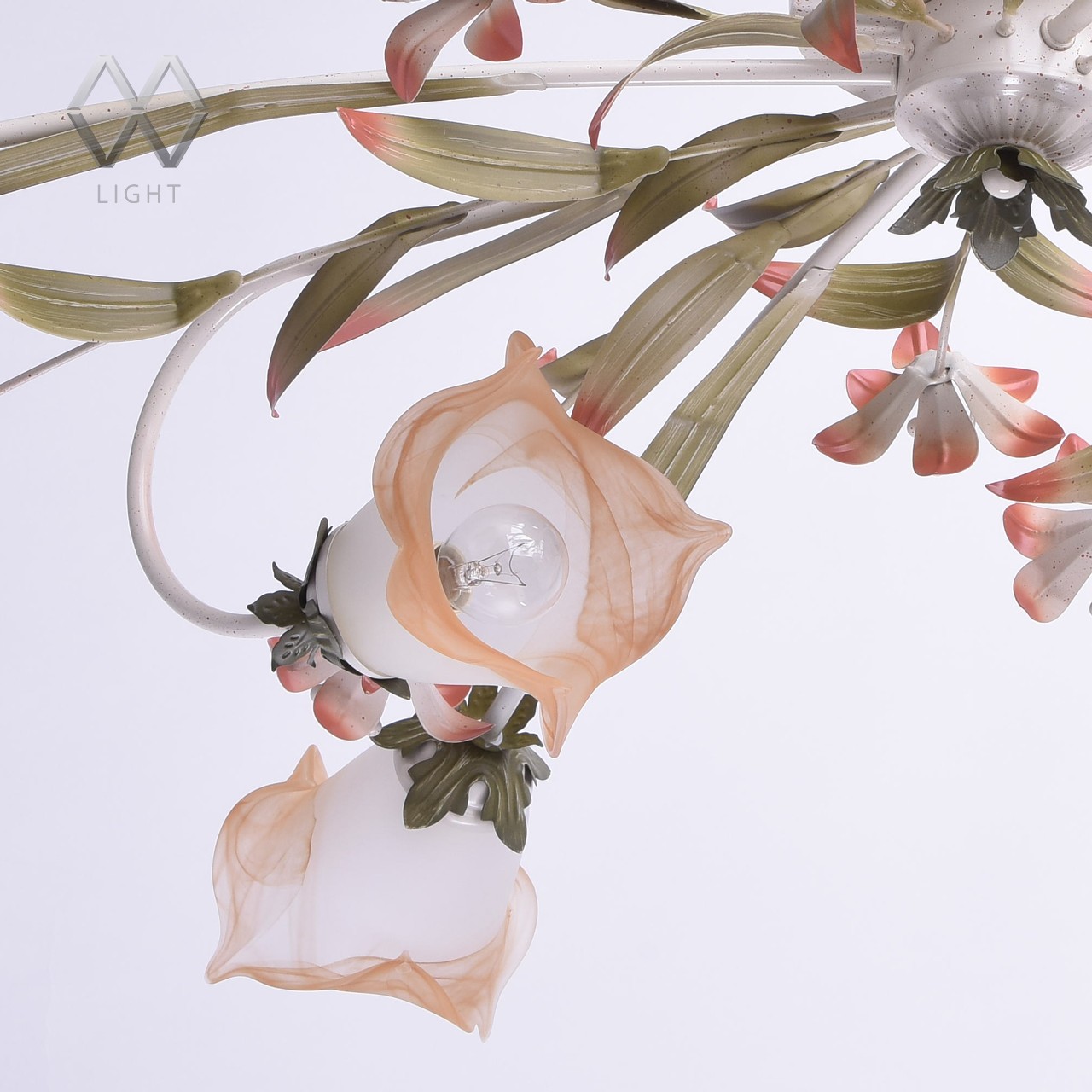 Нежный флористический декор светильника из коллекции «Восторг» наполнит обстановку комнаты романтикой и летним теплом. Металлическое основание эффектно смотрится в сочетании с растительным декором, окрашенным вручную. Стеклянные плафоны стилизованы под бутоны красивых цветов с плавным переходом от белого цвета к оранжево-розовому оттенку. Оригинальные формы и изящные линии привнесут в обстановку спальни или гостиной комнаты спокойствие и гармонию. Рекомендуемая площадь освещения порядка 18 кв.м.Преимущества модели