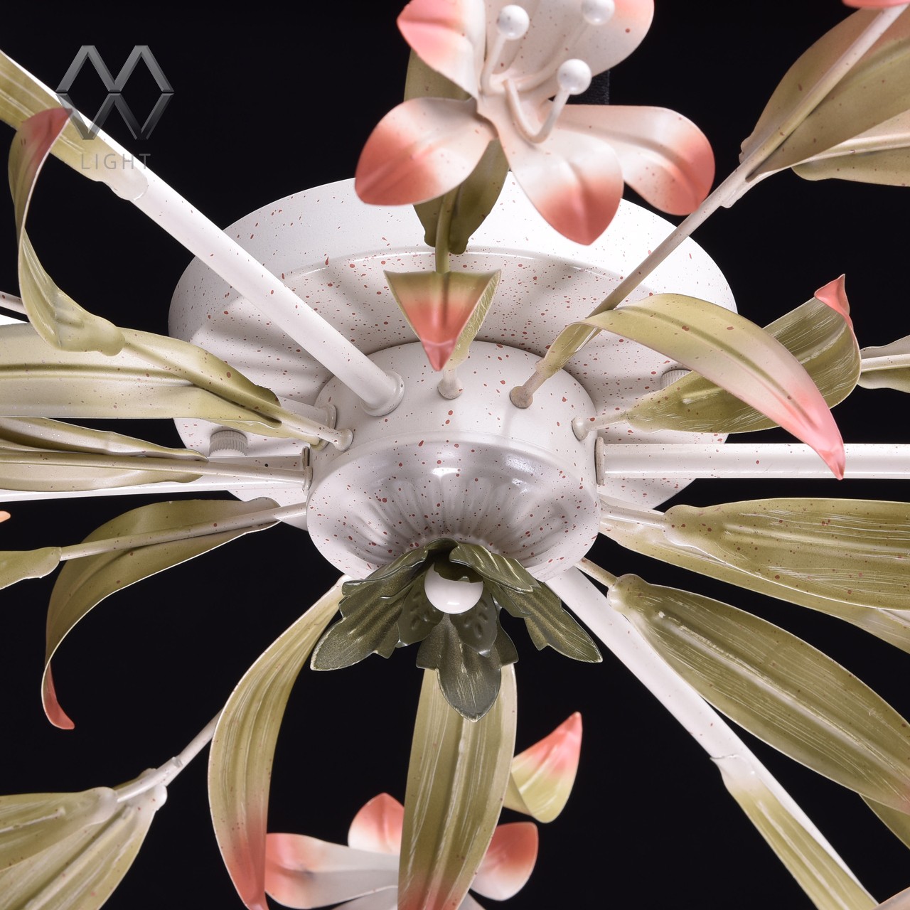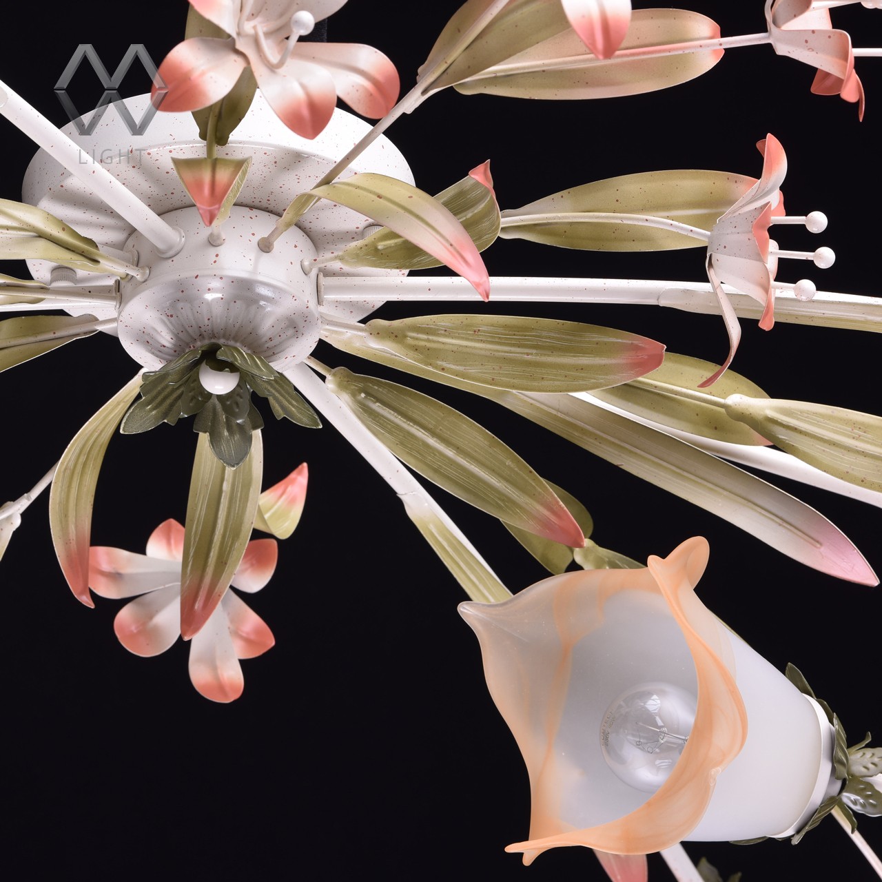 Дизайн свеильника в популярном флористическом стиле. Высокие параметры освещенности. Теплая цветовая гамма светильника позволяет создать уютную атмосферу. Потолочная люстра - идеальный вариант для стандартных потолков.Стилевые решения интерьера