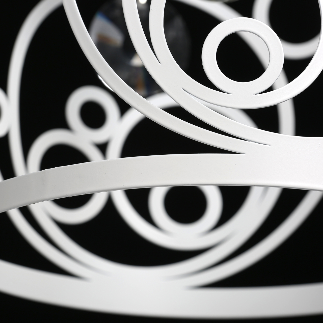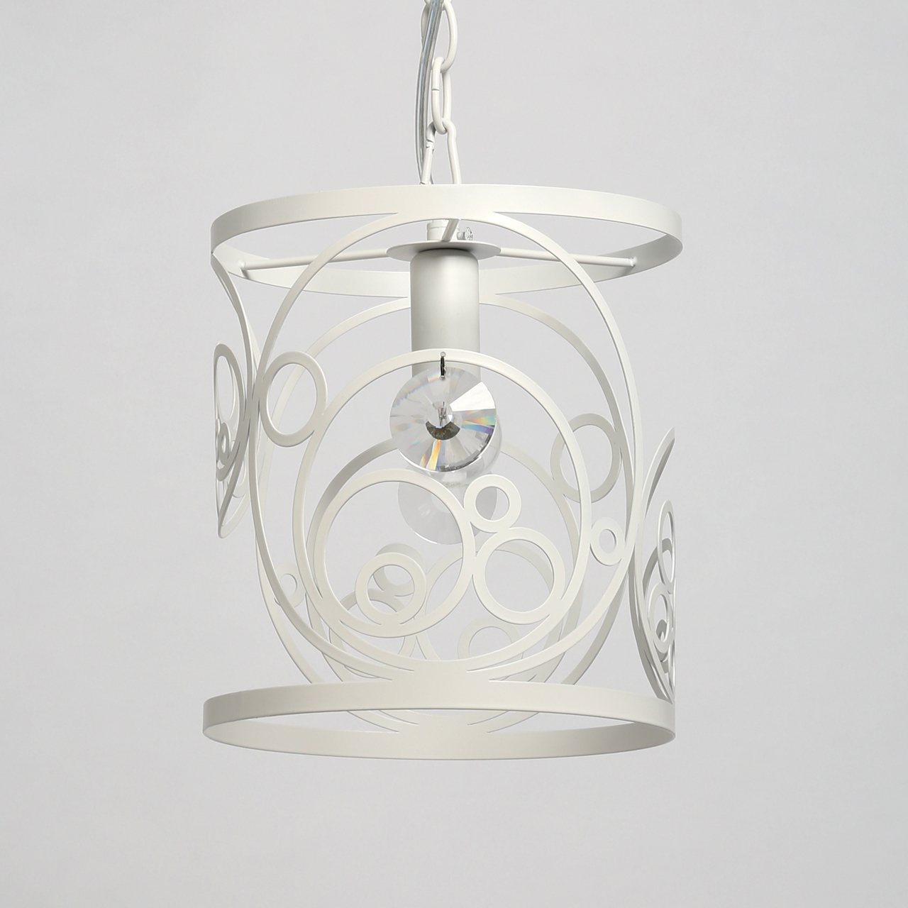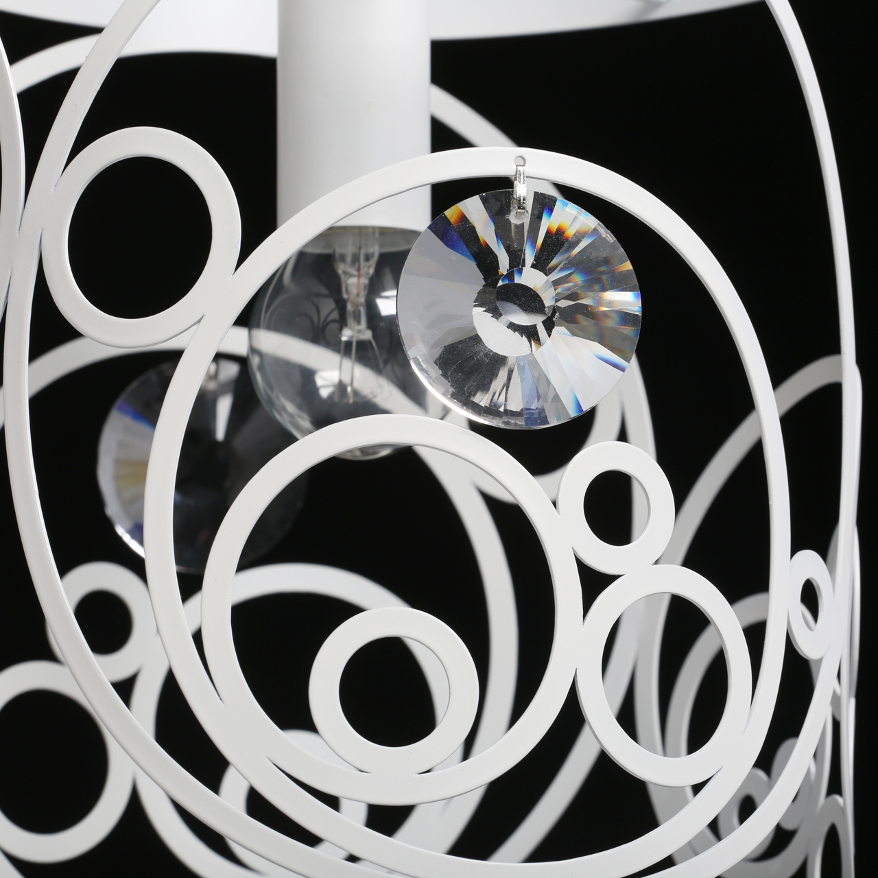 Основание светильника выполнено из металла и окрашено в белый цвет. Плафон выполнен по технологии лазерной резки. Светильник декорирован прозрачным хрусталем круглой формы со сложной огранкой.Тип помещения