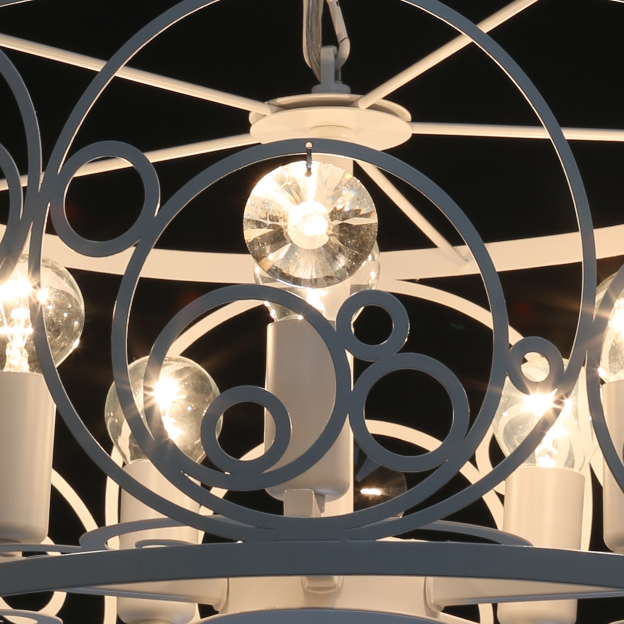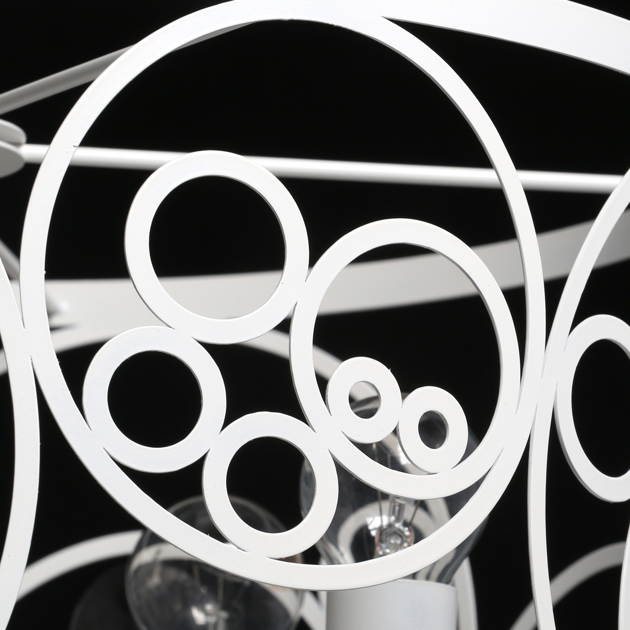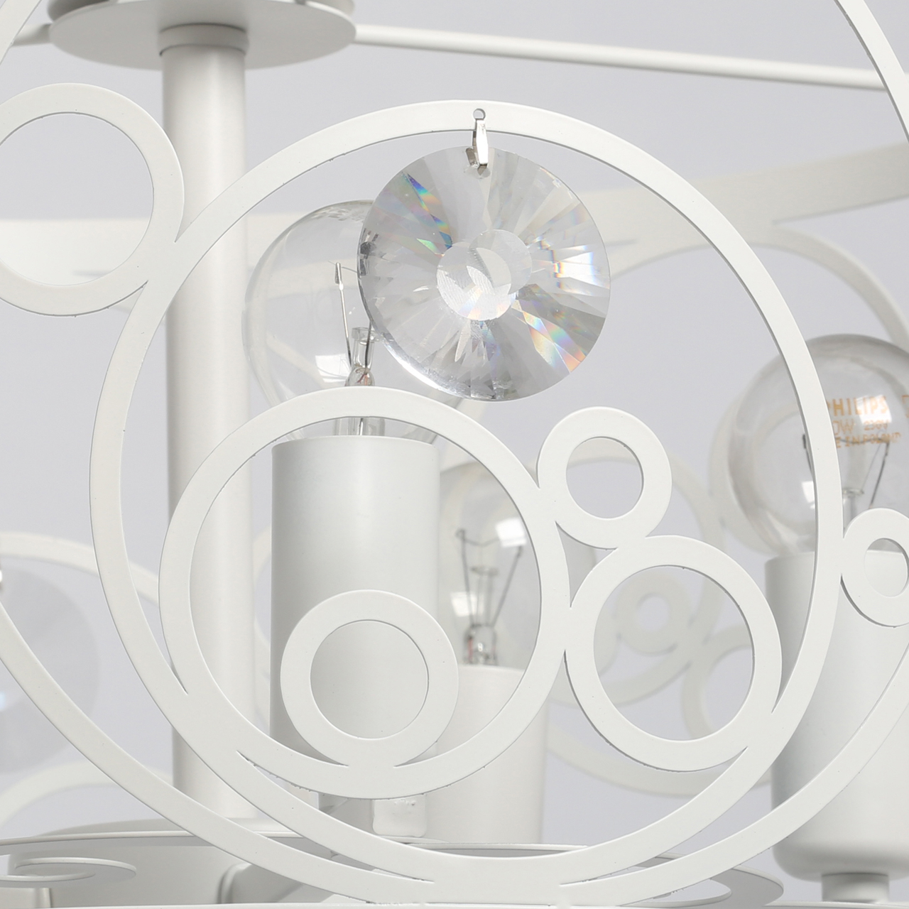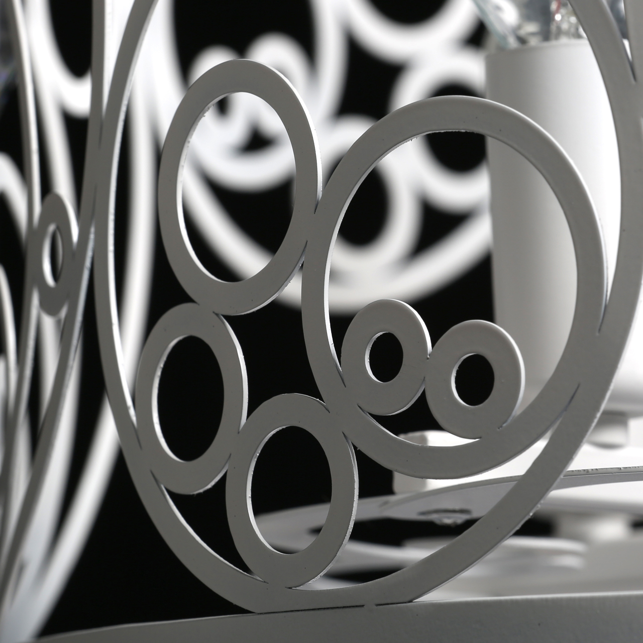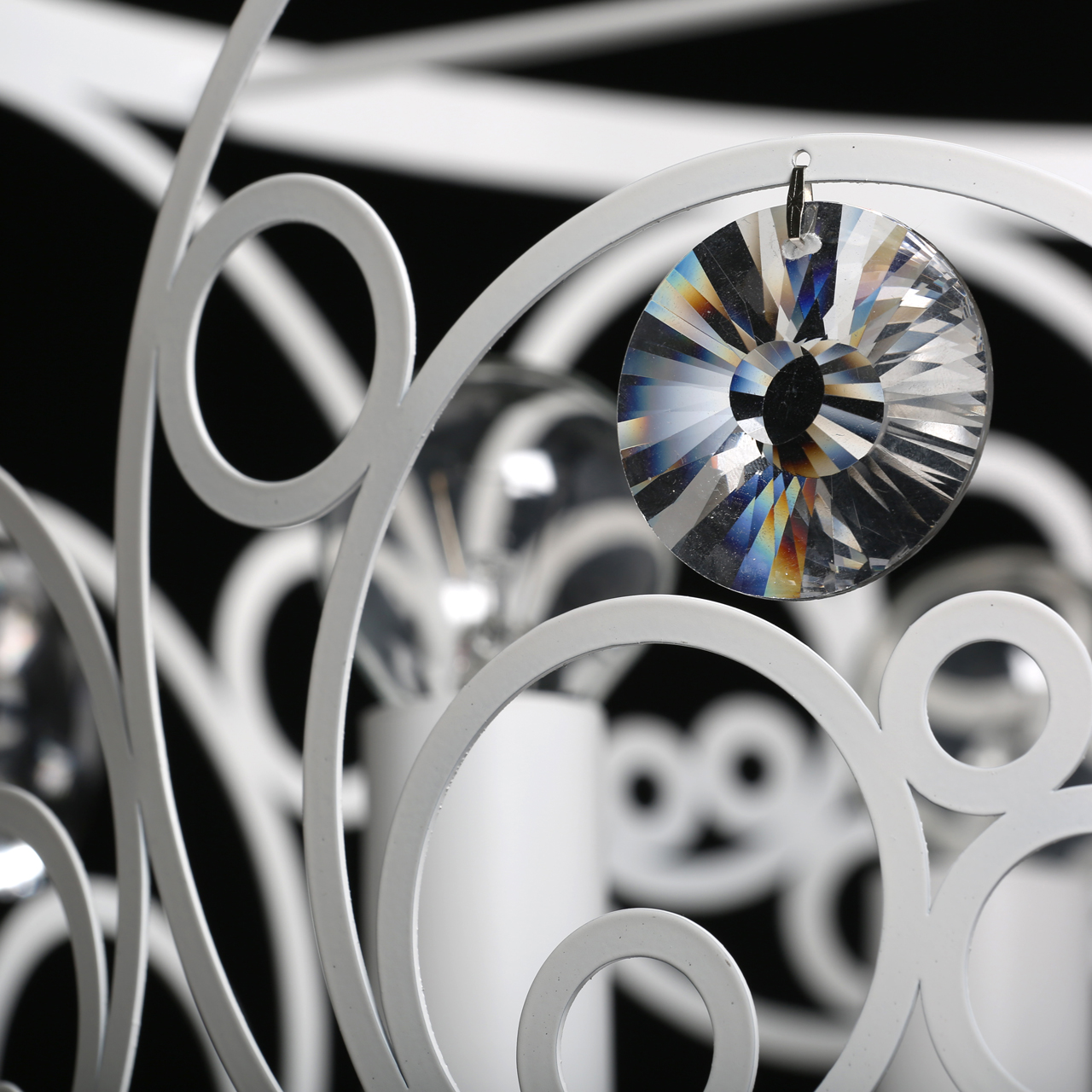 Основание светильника выполнено из металла и окрашено в белый цвет. Плафон выполнен по технологии лазерной резки. Светильник декорирован прозрачным хрусталем круглой формы со сложной огранкой.Тип помещения