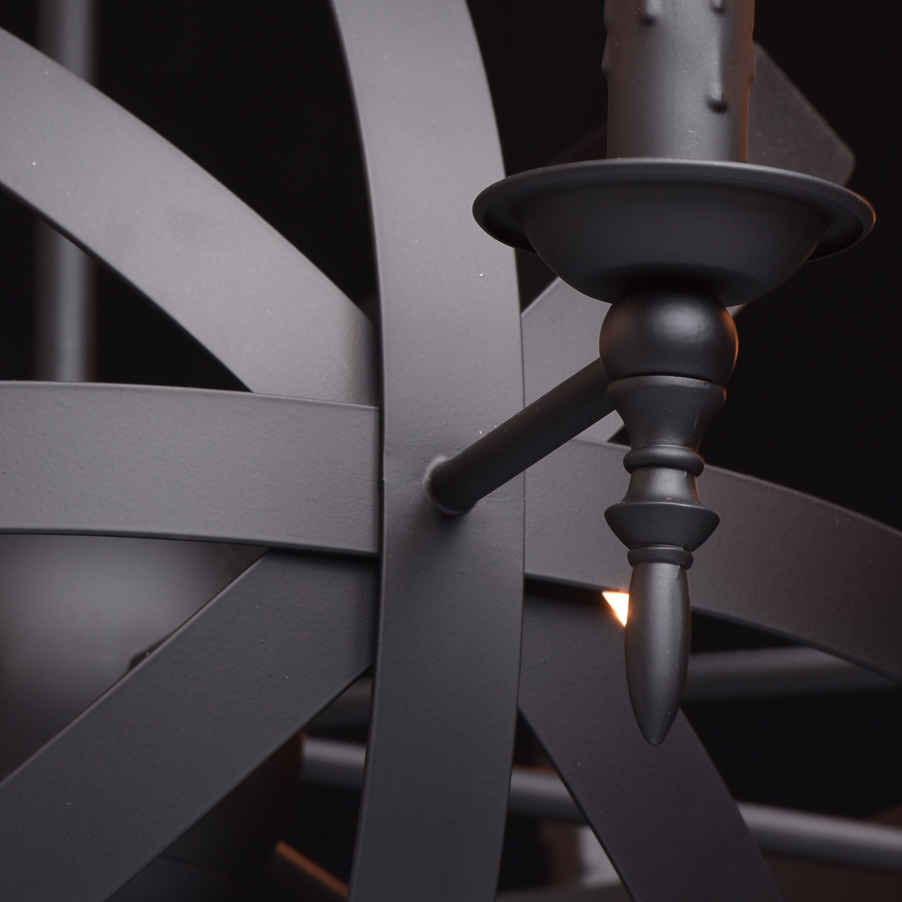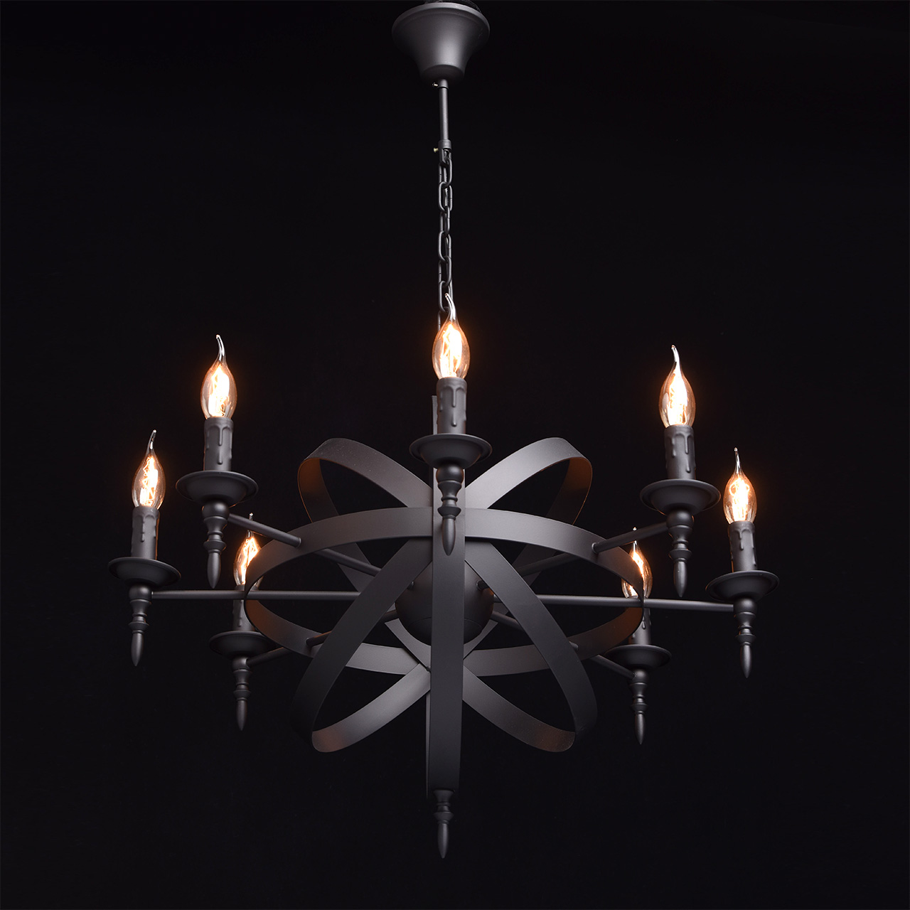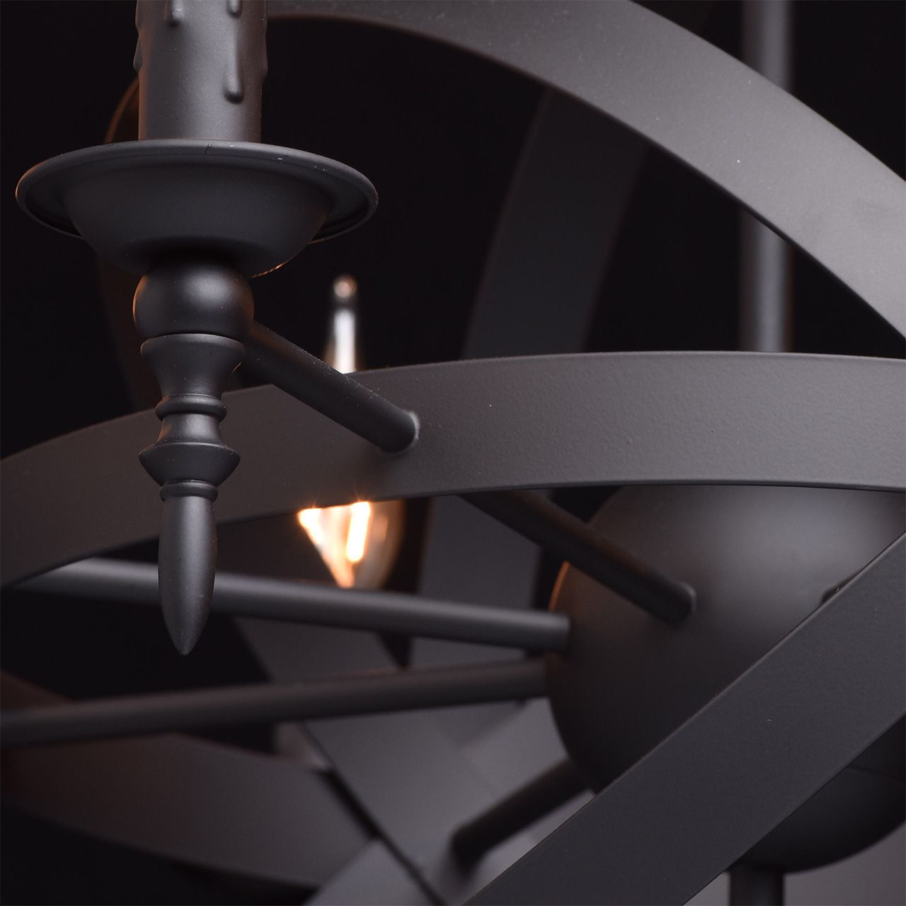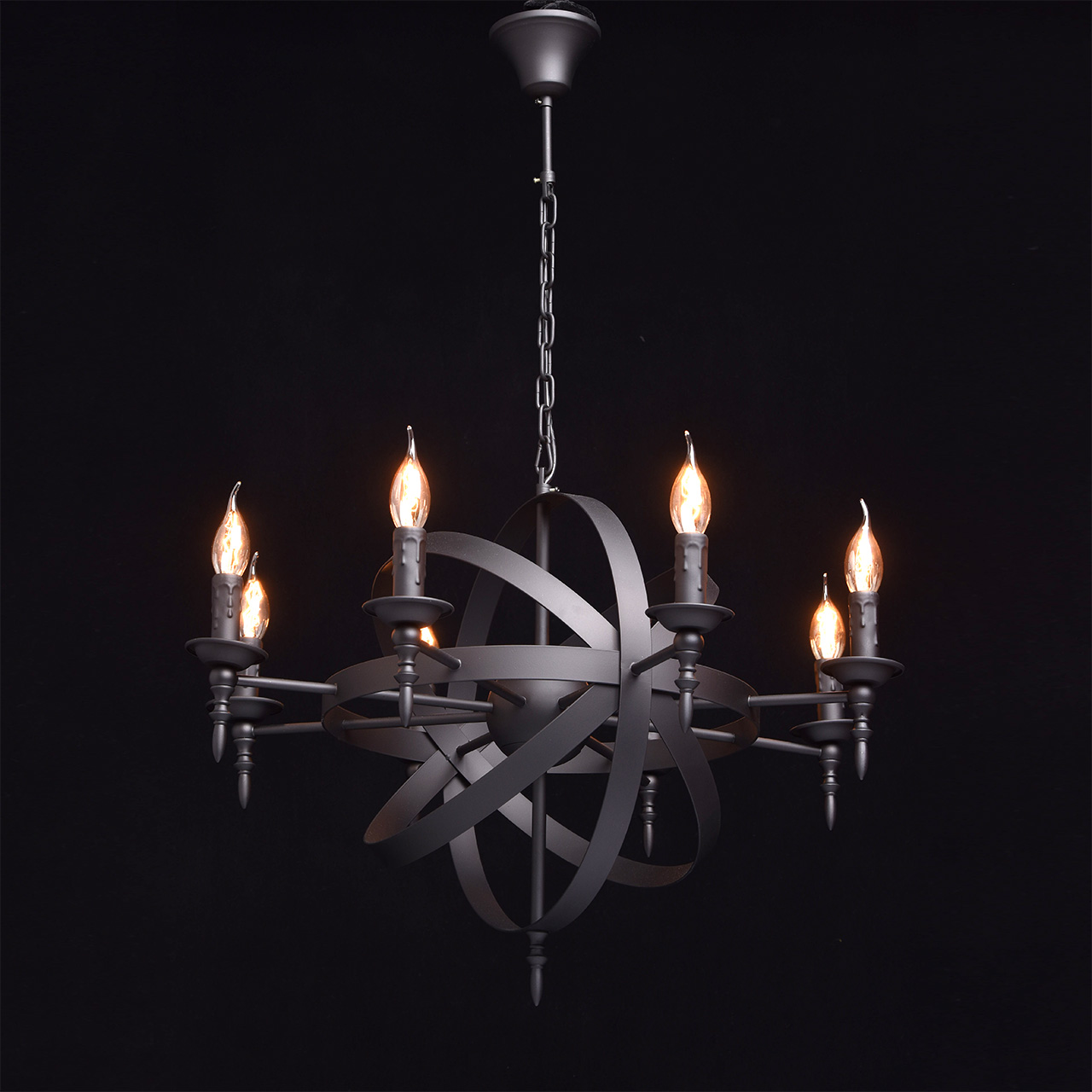 Готический дизайн люстры из коллекции «Замок» привлекает сочетанием классических деталей с современными элементами. Люстра выполнена в единой цветовой гамме матового чёрного цвета. Основание из металла плавно переходит в подсвечники для ламп, выполненные в виде оплавленной свечи и напоминающие о классических традициях. Композиция дополнена сферическим переплетением плоских металлических пластин вокруг шара в центральной части светильника. Стильный, трендовый дизайн позволяет люстре «Замок» гармонично смотреться в любой обстановке. Рекомендуемая площадь освещения порядка 24 кв.м.Преимущества модели
