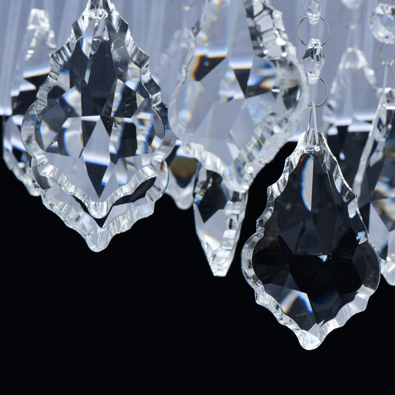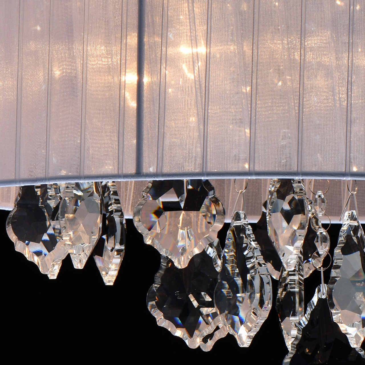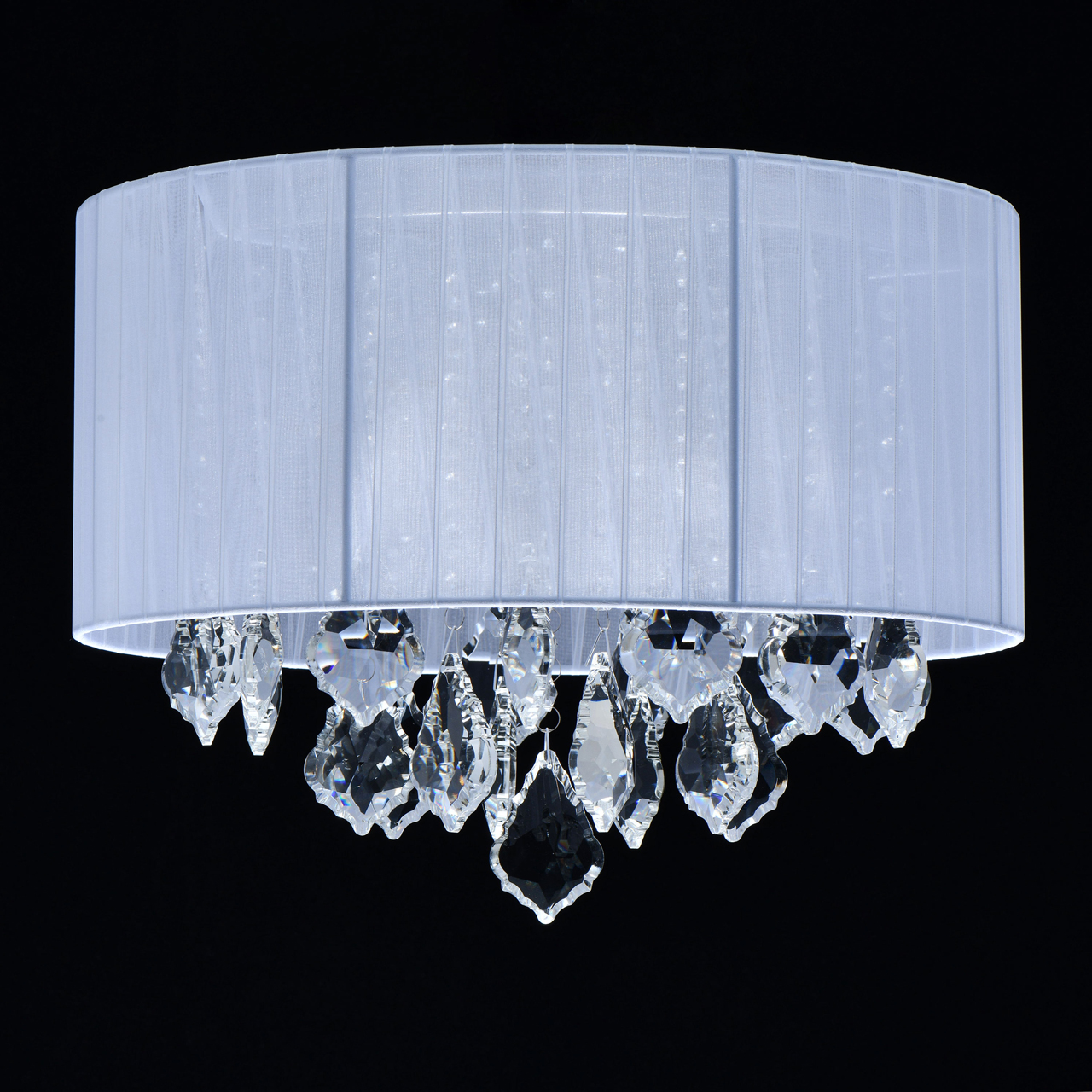 Актуальный дизайн в элегантном стиле ар-деко Абажур из прозрачной органзы обеспечивает мягкий световой поток Компактная высота модели идеальна для стандартной высоты потолка. Хрустальные подвески оригинальной дубовидной формы создают красивую игру светаСтилевые решения интерьера