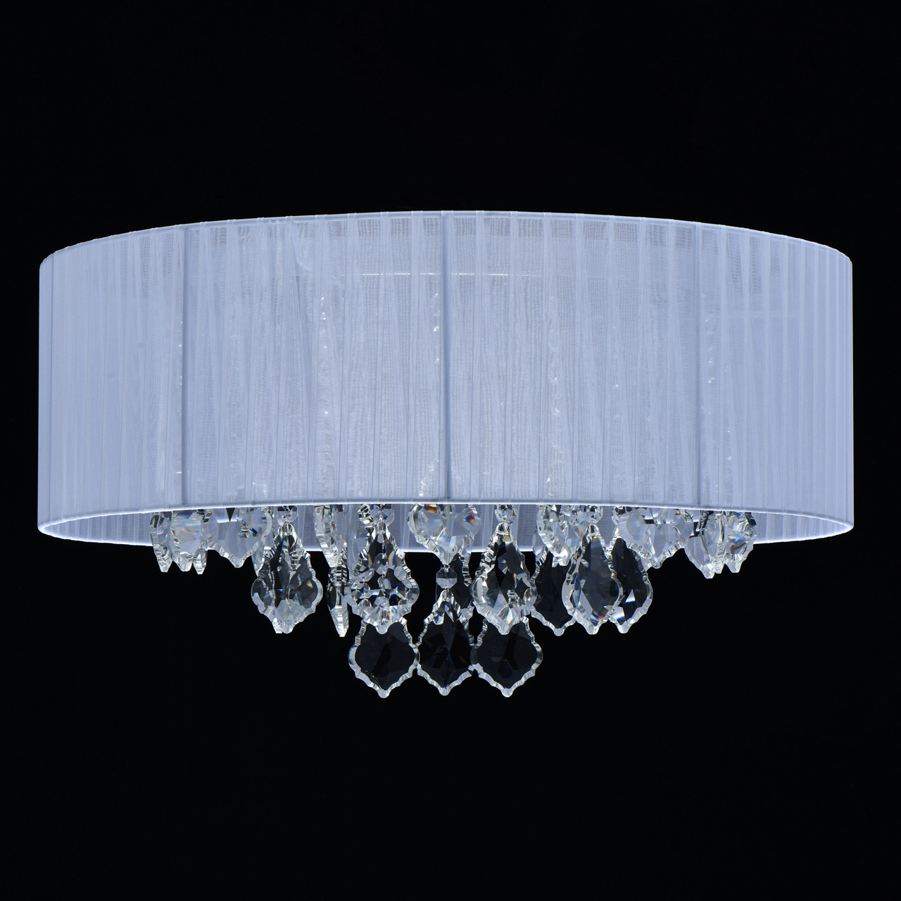 Основание светильника выполнено из металла и гальванизировано в цвет хрома. Плафон выполнен из органзы белого цвета. Светильник декорирован прозрачным хрусталем формы октагон и дубовый лист.Тип помещения