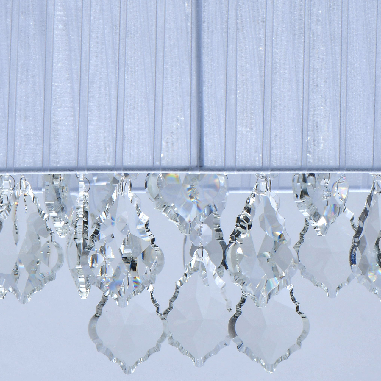 Актуальный дизайн в элегантном стиле ар-деко Абажур из прозрачной органзы обеспечивает мягкий световой поток Компактная высота модели идеальна для стандартной высоты потолка. Хрустальные подвески оригинальной дубовидной формы создают красивую игру светаСтилевые решения интерьера