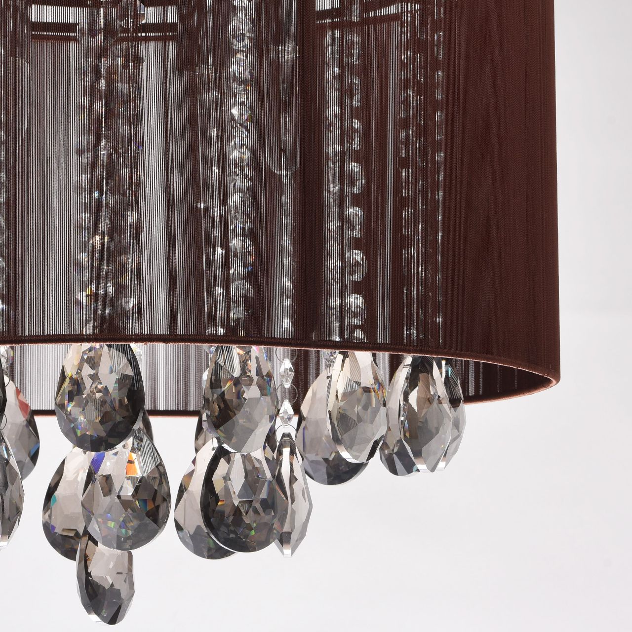 Основание: сталь, гальваника в цвет хрома. Абажур: нити коричневого цвета. Подвески из хрусталя категории A-grade сложной огранки: прозрачный хрусталь формы октагон и каплевидный хрусталь, гальваника в цвет топаза.Тип помещения