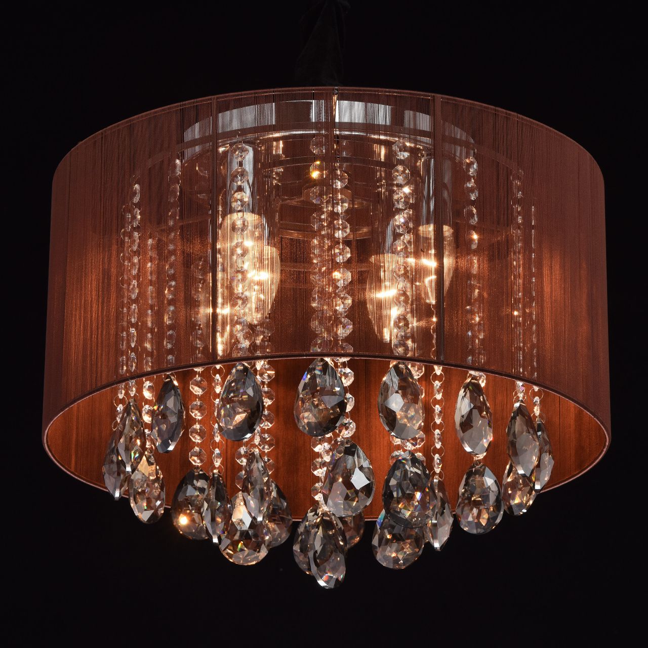 Современный элегантный дизайн позволяет люстре вписаться в большинство интерьеров. Люстра создает рассеянное и в тоже время яркое освещение Элегантный абажур из органзы цвета шоколад и декоративные подвески из хрусталя делают люстру неповторимой Роскошные хрустальные подвески цвета товаз создают волшебную игру света. Премиальное качество по доступной ценеСтилевые решения интерьера