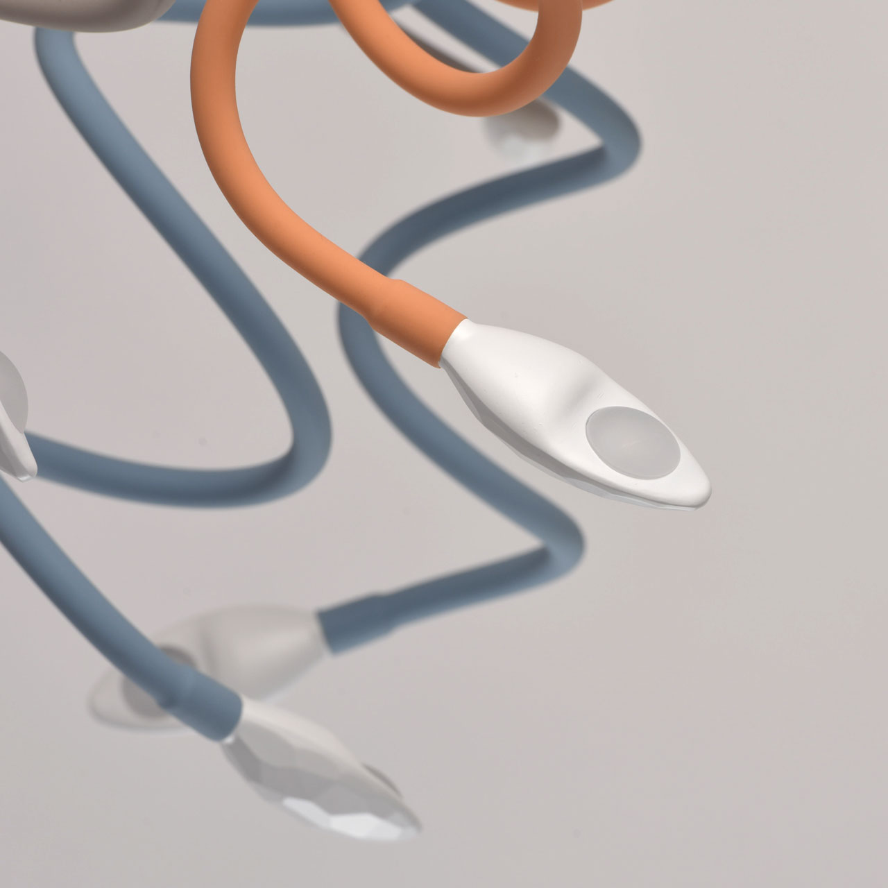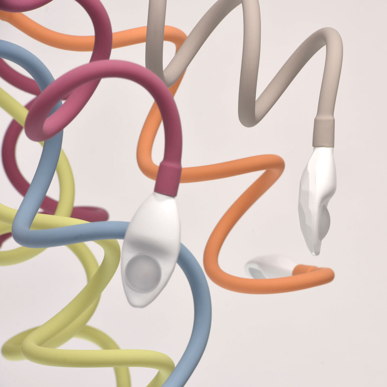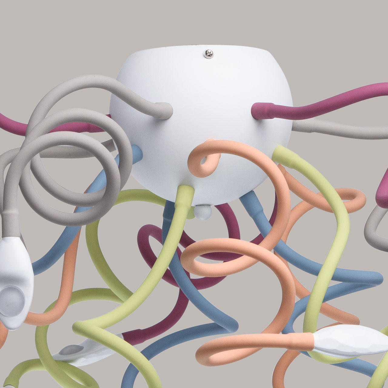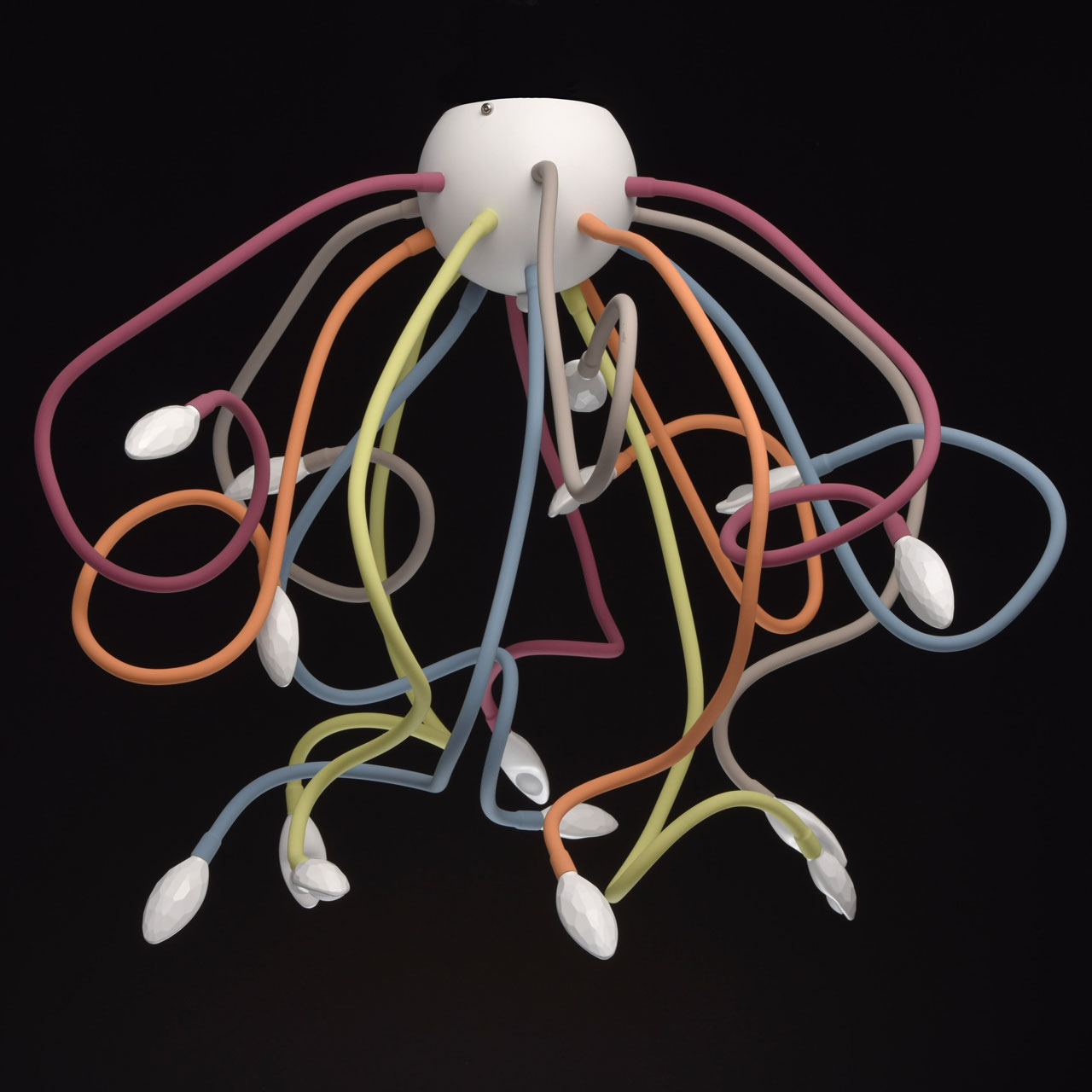 Основание светильника выполнено из металла, окрашенного в белый цвет. Потолочная чаша: обработка на токарном станке. Гибкие рожки: силикон красного, голубого, желтого, зеленого и розового цветов. Светодиодный источник света типа СOB.Тип помещения