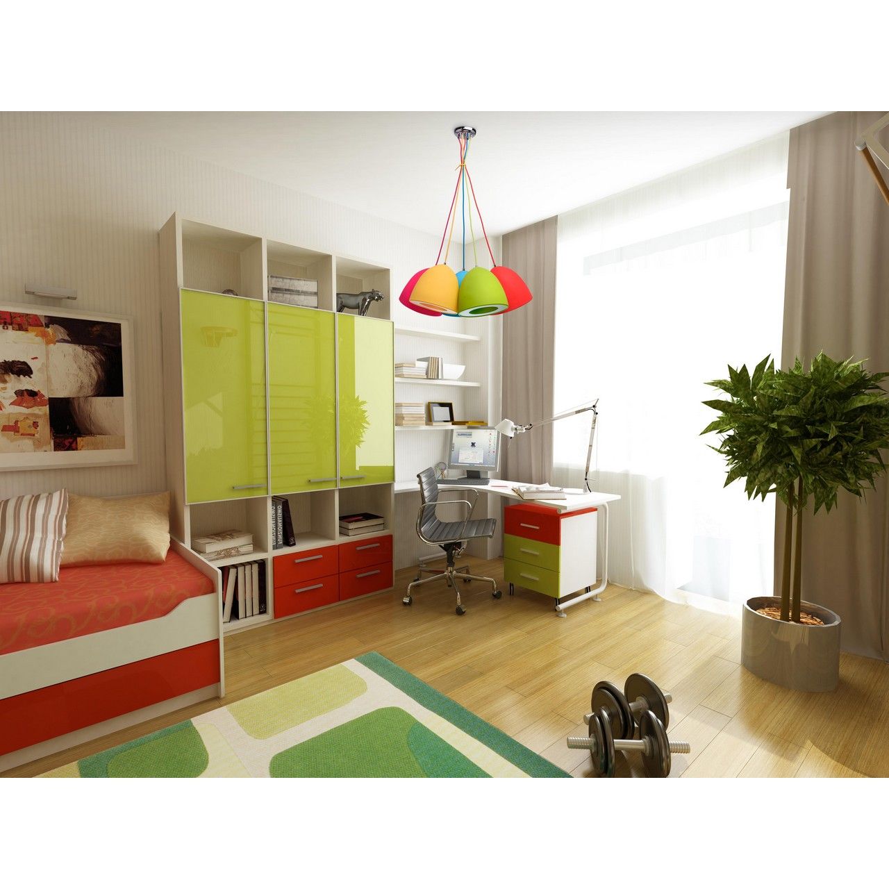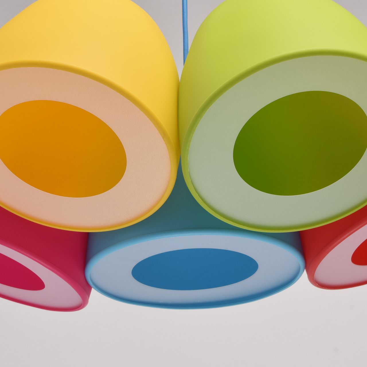 Ультрамодный яркий дизайн сделает люстру украшением любой детской комнаты Красочные обращенные вниз плафоны с создают яркое равномерное освещение. Яркие плафоны окрашены в разные цвета, которые гармонирует с цветом подвесного шнура и дают возможность разместить люстру в детский интерьер, выполненный в любой цветовой гамме.Стилевые решения интерьера