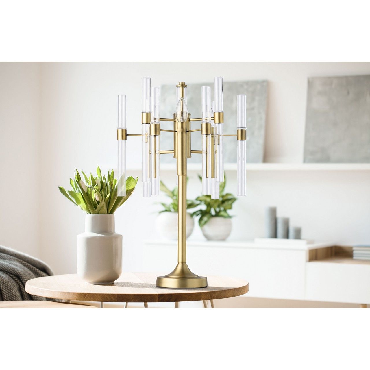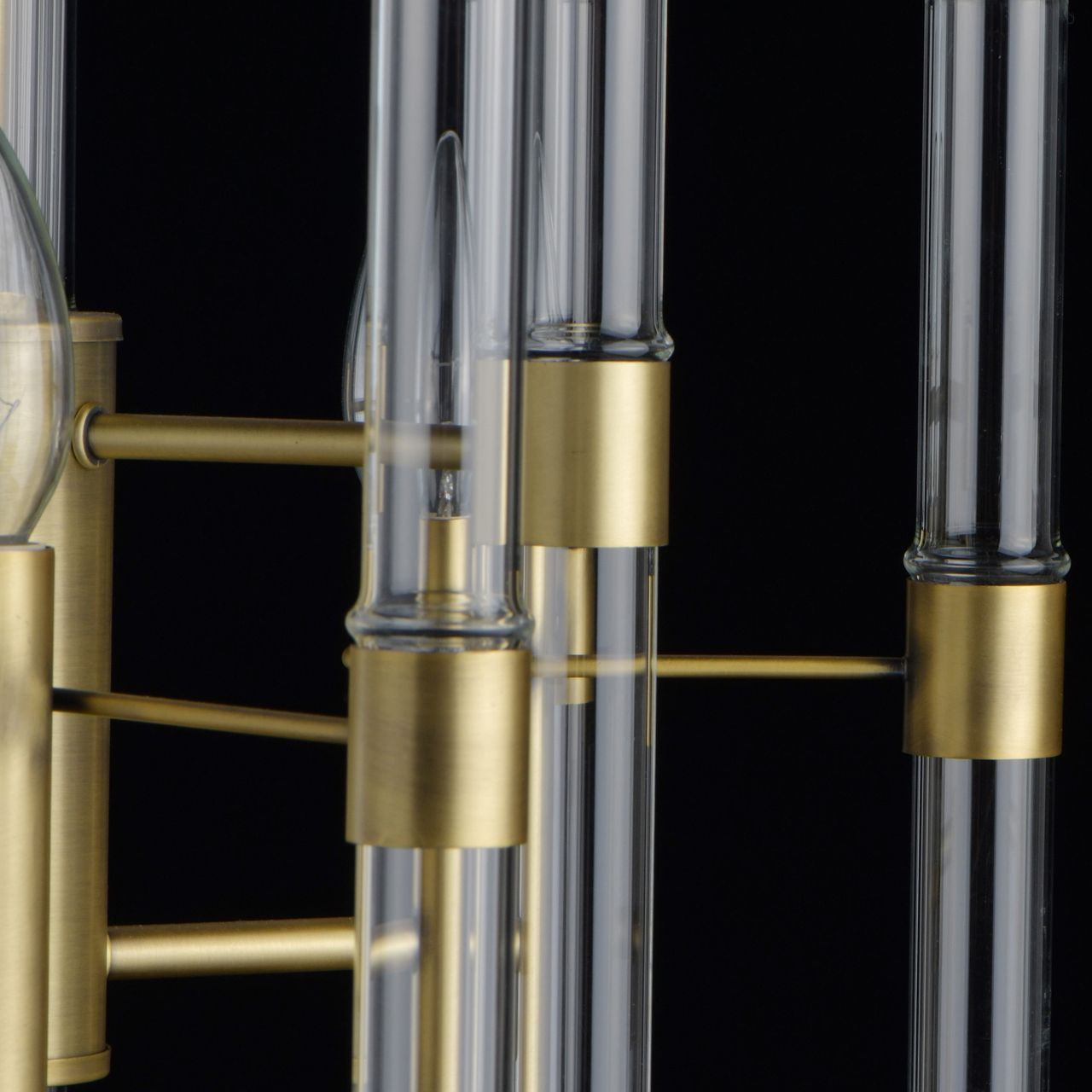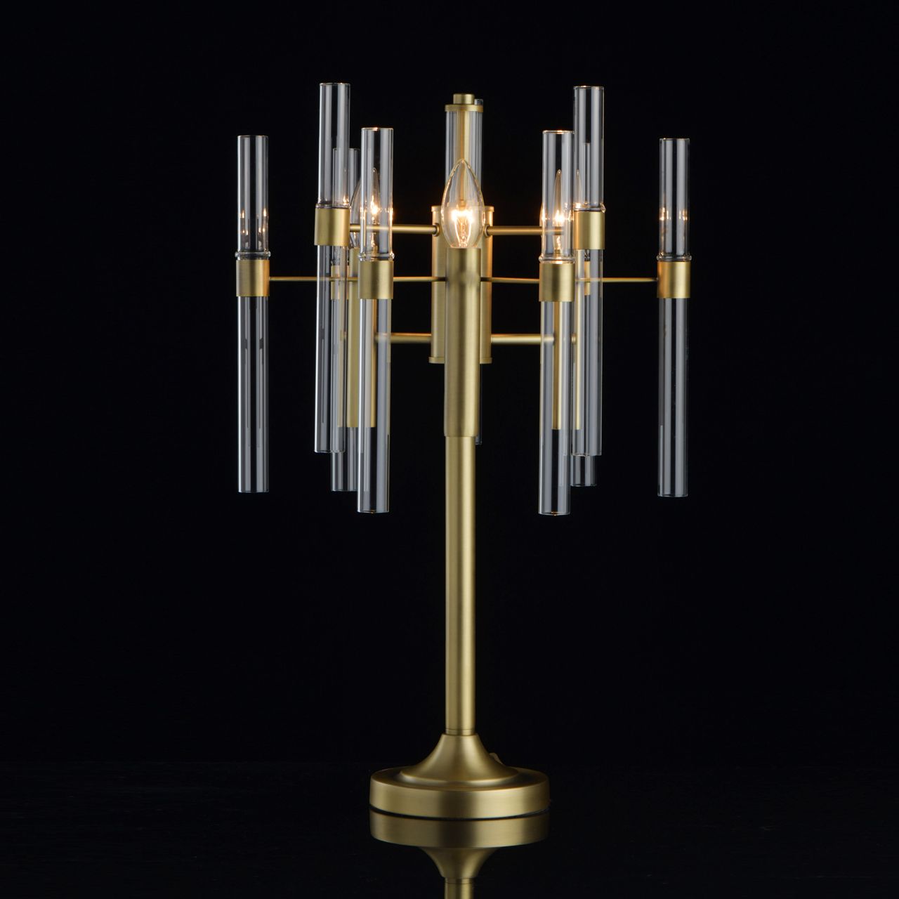 Основание настольной лампы выполнено из металла и гальванизировано в цвет латуни. Светильник декорирован полыми стеклянными трубками.Тип помещения
