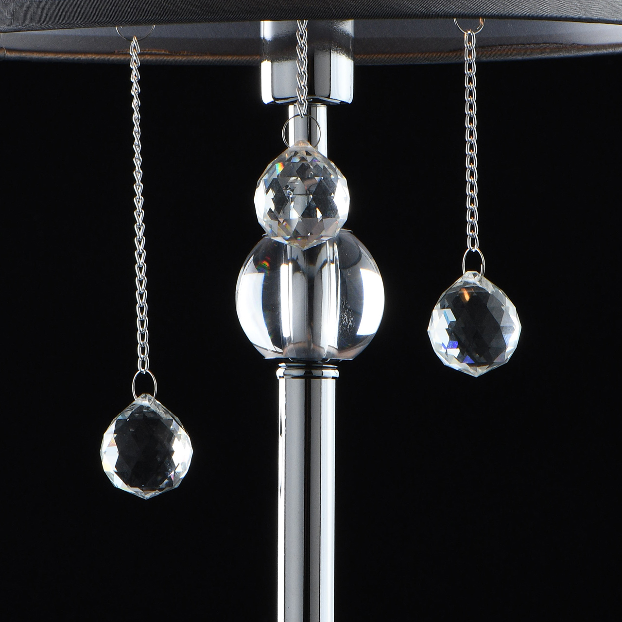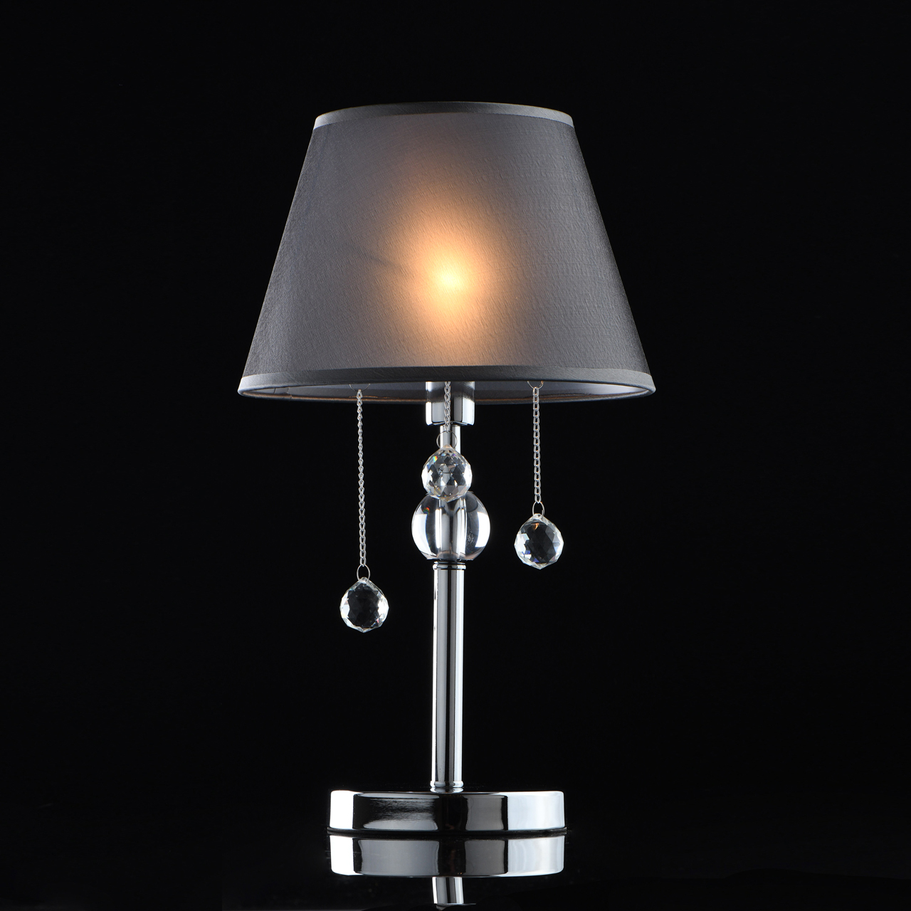 Основание настольной лампы выполнено из металла и гальванизировано в цвет хрома. Текстильный абажур из органзы серого цвета с термостойким акрилом внутри. Декоративные подвески из прозрачного хрусталя на цепочках в цвет основания.Тип помещения