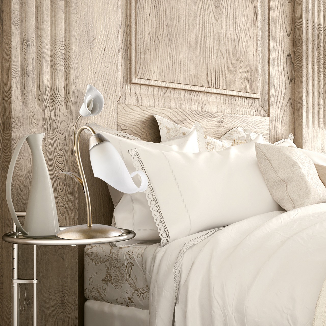 Основание светильника выполнено из металла и окрашено в цвет перламутрового золота. Плафон выполнен вручную из алебастрового стекла. Настольная лампа декорирована глазурированным фарфором белого цвета.Тип помещения