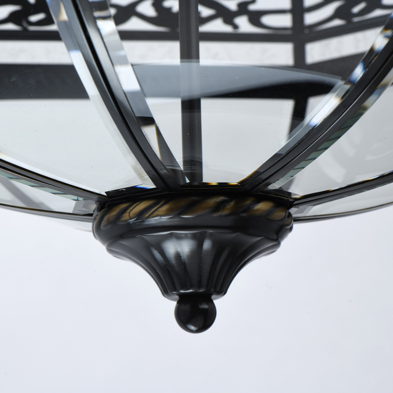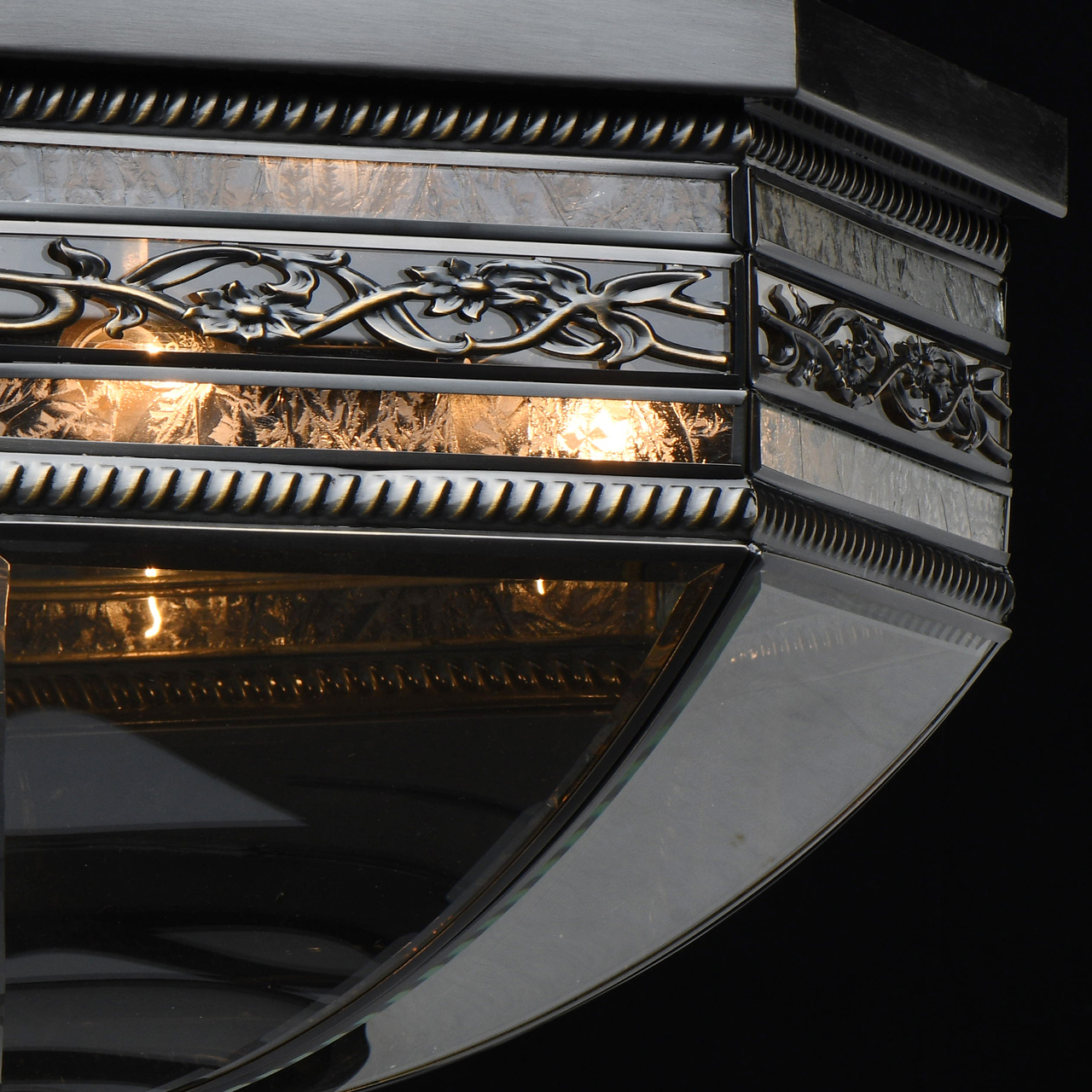 Светильник выполнен из листовой черненной латуни. Плафон, разделенный на сектора, выполнен из прозрачного стекла. В верхней части плафон декорирован чеканкой, элементами художественного литья и вставками из стекла с рисунком, нанесенным пескоструйным матированием.Тип помещения