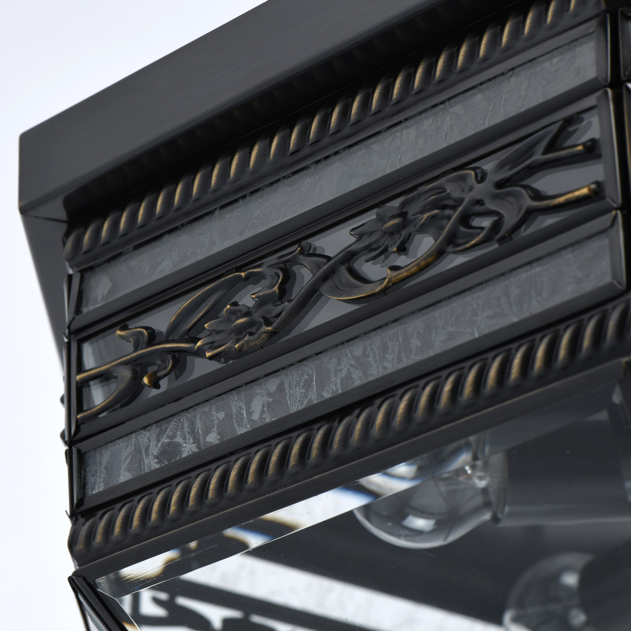Основание светильника выполнено из черненой латуни, декорировано чеканкой. Стекло полностью герметично, исключает образование зазоров. Компактные размеры по высоте идеальны для стандартных потолков. Увеличенный диаметр светильника обеспечивает высокие параметры освещенности. Система отвода конденсата гарантирует долгий срок службы источников света. IP 44 защита от влажности и пыли. Полная семья для комплексного освещения интерьеров и ландшафтных зон.Стилевые решения интерьера