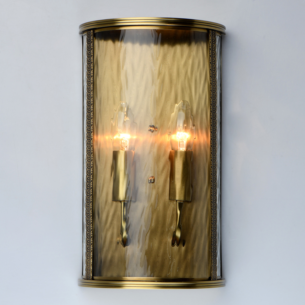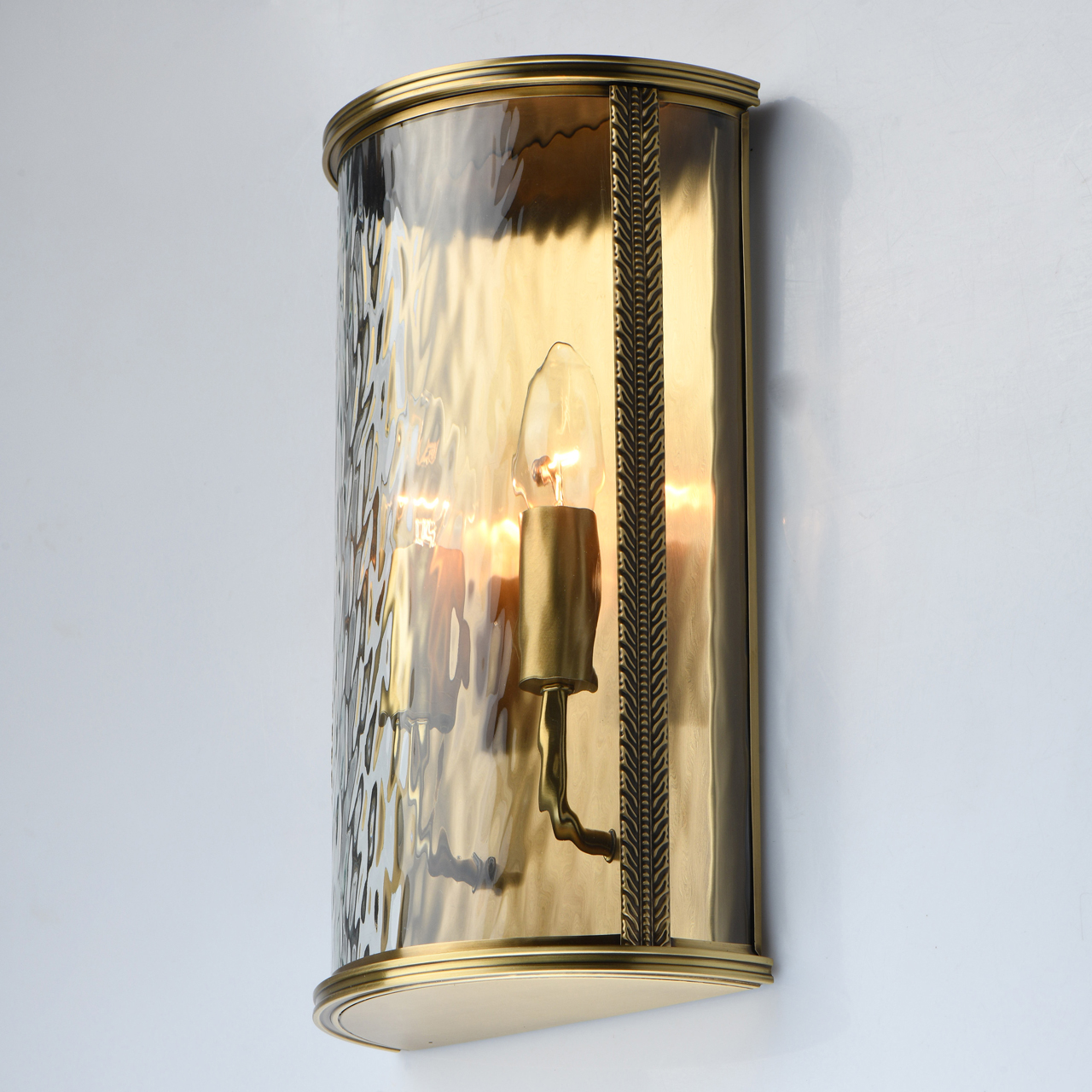 Основание из благородной латуни украшено художественной чеканкой. Фактурное стекло с эффектом дождевых струй полностью герметично. Система отвода конденсата гарантирует долгий срок службы источников света. IP 44 защита от влажности и пыли. Полная семья для комплексного освещения интерьеров и ландшафтных зон.Стилевые решения интерьера