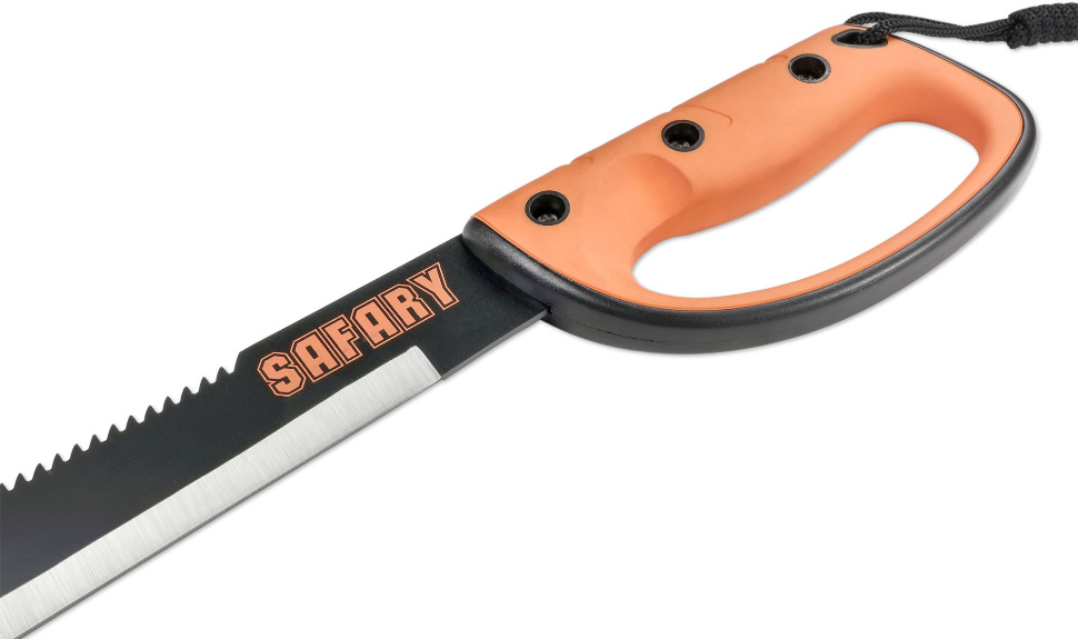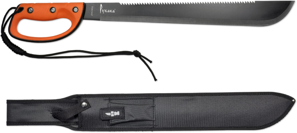Длинное острое мачете с серрейтором на обухе. Такой тесак может одинаково хорошо рубить тонкие стволы деревьев и кустарников, косить высокие стебли и тростник, а также распиливать толстые ветки. Лезвие из нержавеющей стали сохраняет целостность и остроту заточки долгое время. Рукоять накладная, присоединена к металлической основе прочным крепежом. Кольцевая гарда защищает пальцы ладони от повреждений и увеличивает силу захвата. Шнур, прикреплённый к навершию, играет роль дополнительной фиксации на запястье. В комплект входят нейлоновые ножны.
