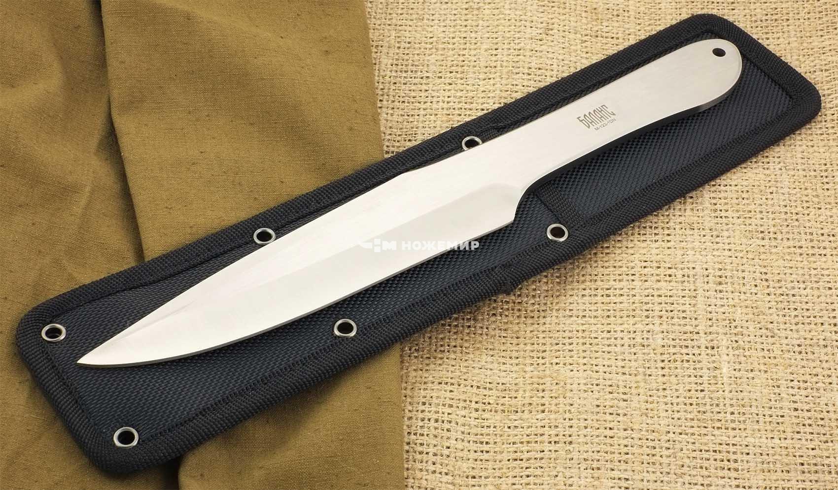 Тяжелый стальной метательный нож для профессионалов. Он изготовлен из стали, содержащей хром, который отлично защищает изделие от воздействия влаги и коррозии. Кроме того, средний процент углерода в сплаве дает ножу относительную мягкость и хорошую упругость. Такой нож при поражении цели мягко входит в мишень и не ломается от удара. Для постоянного использования рукоять модели можно оплести шнуром, отверстие под который предусмотрено на тыльнике. В комплект входит нейлоновый чехол с креплением на ремень.