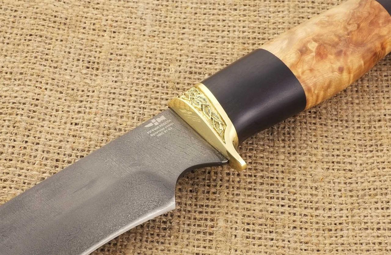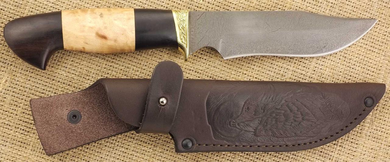 Массивный нож ручной работы из булатной стали. Модель «Скала» может использоваться и в качестве сувенира, и как рабочий охотничий нож. Широкое лезвие-боуи с острым кончиком и подпальцевым упором в нижней части пяты отличается сочетанием твердости и упругости. Широкая хваткая рукоять вырезана из черного граба, а средняя часть дополнена вставкой из карельской березы. Зона крестовины украшена латунным литьем с односторонней нижней гардой и рельефным узором на поверхности. Выступ гарды вместе с изгибом на брюшке рукояти образует удобный упор для указательного пальца. Нож укомплектован кожаным чехлом.
