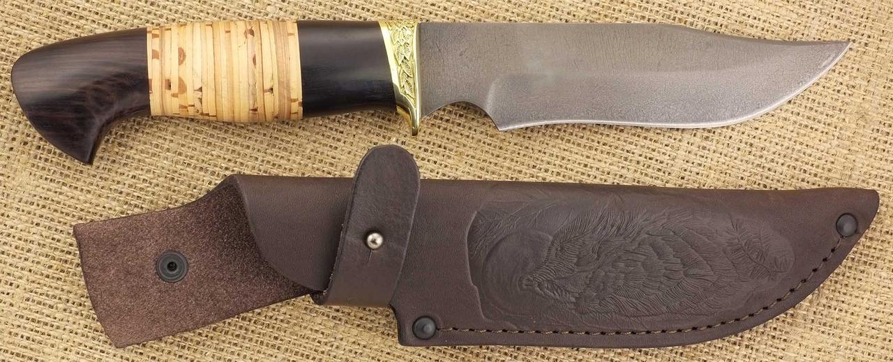 Охотничий сувенирный нож ручной работы в чехле из натуральной кожи. При изготовлении клинка модели «Скала» использовалась булатная сталь. Этот сплав сочетает в себе высокую твердость – до 62 по Роквеллу – и упругость. Рукоять вырезана из граба и дополнена берестяными кольцами. Она присоединена к лезвию глухим всадным способом. Зона крестовины укреплена латунным литьем. В комплект входят кожаные ножны с подвесом на ремень и застежкой для фиксации клинка. На их поверхности выполнено тиснение изображения хищника.