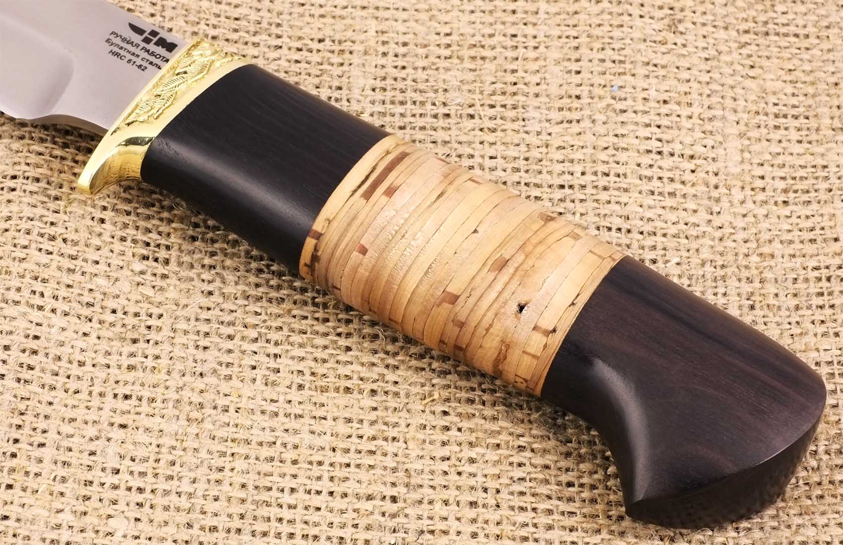 Рукоять инструмента изготовлена из дерева венге и берестяных наборных пластин. Форма рукояти способствует ее надежному и крепкому обхвату. Для безопасности пользователя нож оснащен латунным больстером, который предотвращает от травмирования при выполнении работ. Помимо этого больстер несет декоративную функцию и служит достойным украшением инструмента. К ножу прилагаются ножны, изготовленные из качественной плотной кожи.