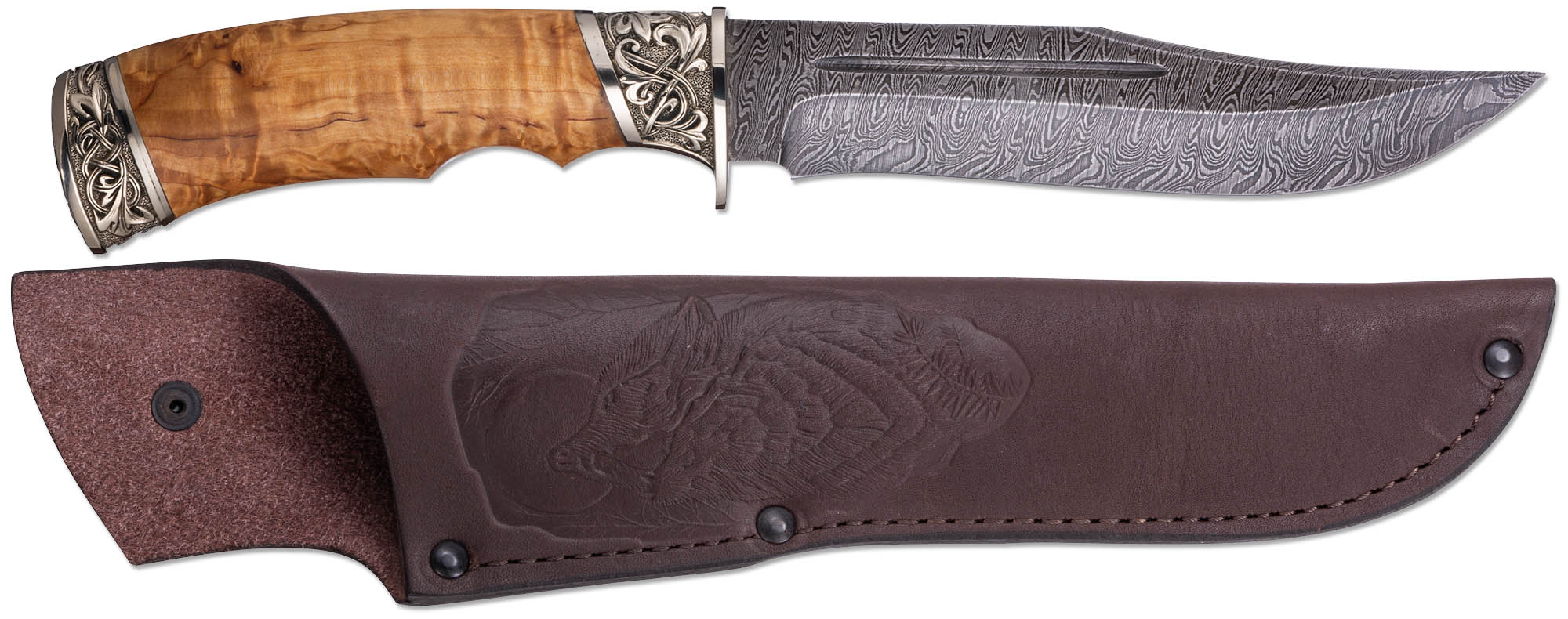 Для декорирования модели использовалось художественное литье из латуни. Навершие украшает нож и служит дополнительной балансировкой. Эргономичная рукоятка удобно размещается в руке и не скользит. В оформлении использована карельская береза, сохраняющая природный рисунок.