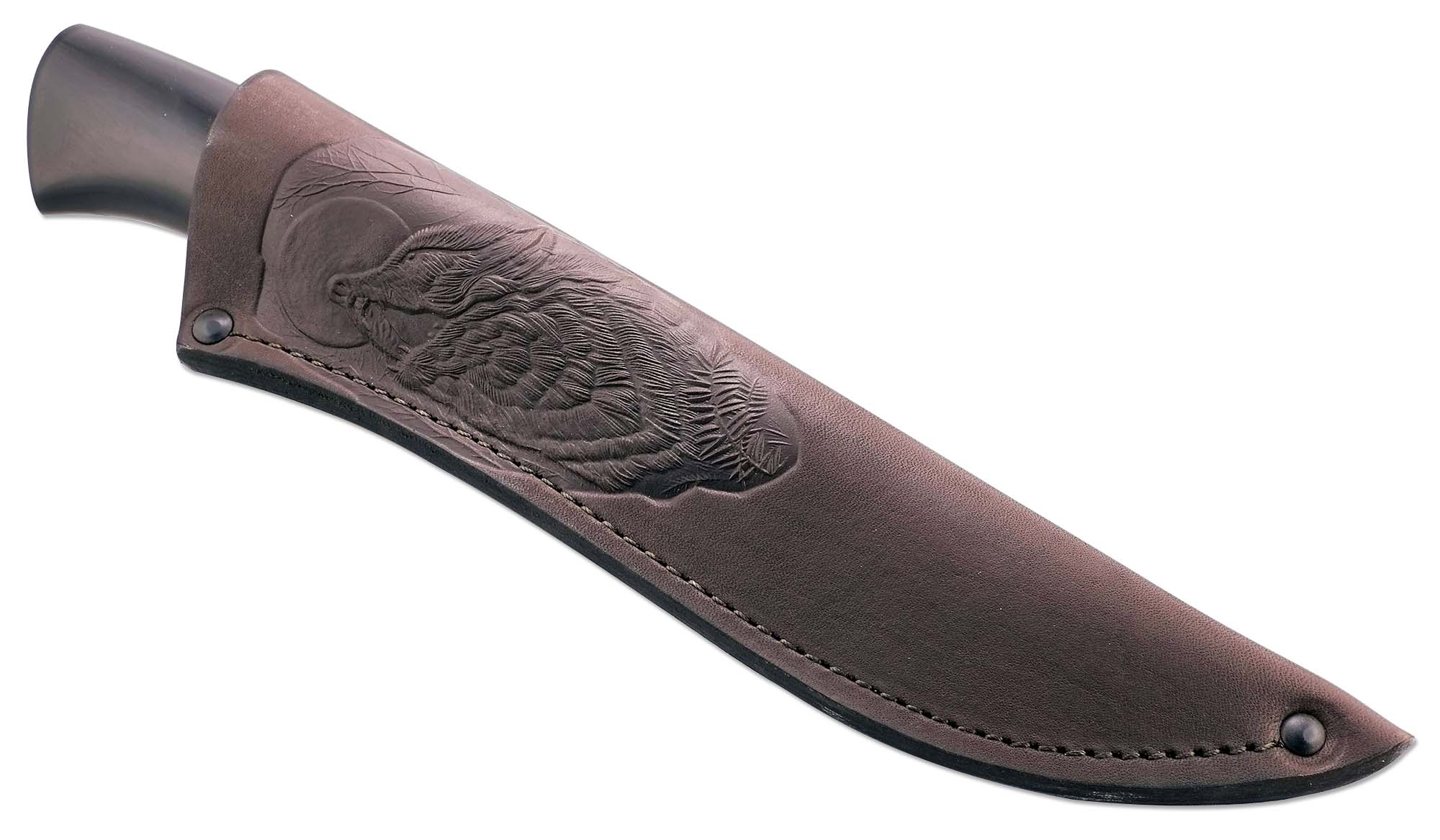 Компания Ножемир предлагает нескладной нож модели ВАРАН (5719)д из дамасской стали. В специализацию компании входит, в том числе и изготовление охотничьих ножей, а предлагаемые к продаже клинки изготовлены в цехах компании в Нижегородской области, в городе Ворсма. При ручной ковке каждого из них использовались наборы пластин разной жёсткости, и в обязательном порядке мастера строго следовали технологии изготовления дамасских лезвий. ВАРАН (5719)д станет незаменимым инструментом при разделке туш и снятии шкур. К лезвию применена бритвенная заточка, а прочность клинка, доведённая до 59 — 60 HRC, гарантирует не только долговечность эксплуатации ножа, но и долгое использование без дополнительной заточки. Общая длина изделия равна 278 мм, где на долю лезвия отведено 150 мм. Толщина клинка - 3,5 мм. Нож отлично сбалансирован и при долгом использовании не вызывает усталости. Именно уникальный рисунок, получаемый в процессе обработки лезвия, отличает дамасские клинки от всех остальных. Модель ножа ВАРАН (5719)д украшена латунным орнаментом, который нанесён методом литья. Однако покупая ножи, изготовленные по дамасской технологии, необходимо помнить об их подверженности коррозии. Следовательно, даже при незначительном промокании лезвия его необходимо протереть сухой тряпкой. Рукоятка выполнена из граба и дополнительно декорирована берестой, что не только придаёт ручке интересный вид, но и улучшает её сцепление с ладонью человека, орудующего ножом. Ножны, идущие в комплекте, изготовлены из плотной натуральной кожи и надёжно защищают лезвие.