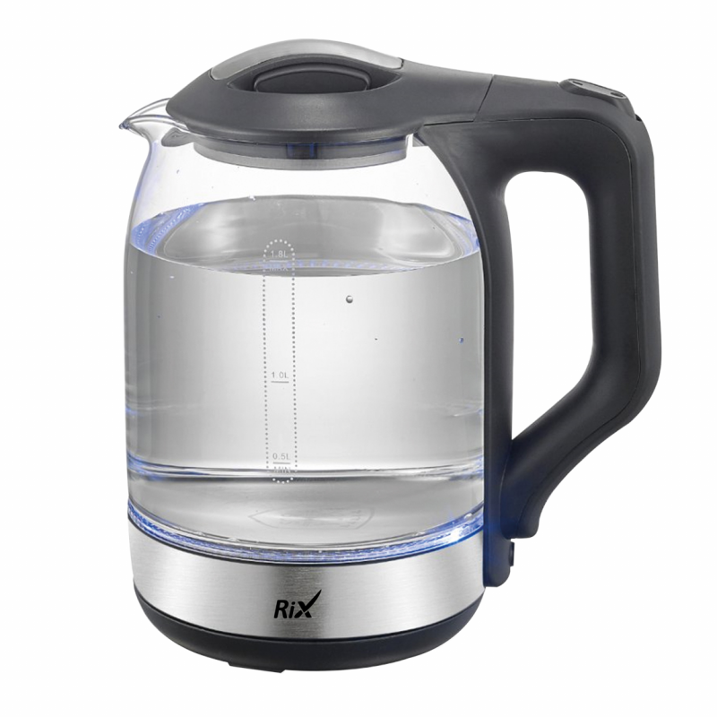 RIX RKT-1831G – вместительный стеклянный чайник с удобными пластиковыми крышкой и ручкой для переноски, исключающими риск получения ожога. Электрические характеристики чайника позволяют использовать его в домах со слабой проводкой, например на даче, при этом его мощности достаточно для того, чтобы вскипятить 1,8 литра воды всего за несколько минут. Корпус из термостойкого стекла максимально нейтрален по отношению к воде, скрытый нагревательный элемент – надёжен и долговечен. Функция автоматического отключения при закипании или недостаточном количестве воды гарантирует безопасное использование прибора и экономию электроэнергии.Характеристики
