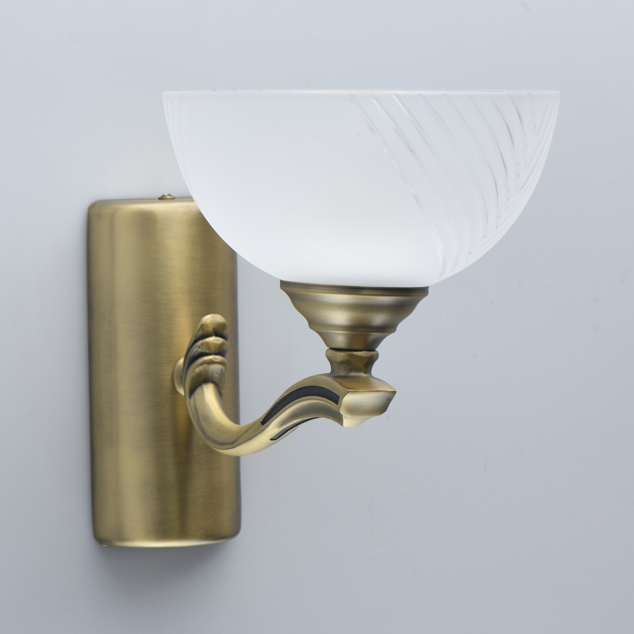 Основание бра выполнено из комбинации сплавов металлов и гальванизировано в цвет античной бронзы. Рожок выполнен по технологии художественного литья. Светильник декорирован стеклянным плафоном, обработанным по технологии пескоструйного матирования. На плафон нанесен геометрический рисунок с помощью алмазного резца.Тип помещения