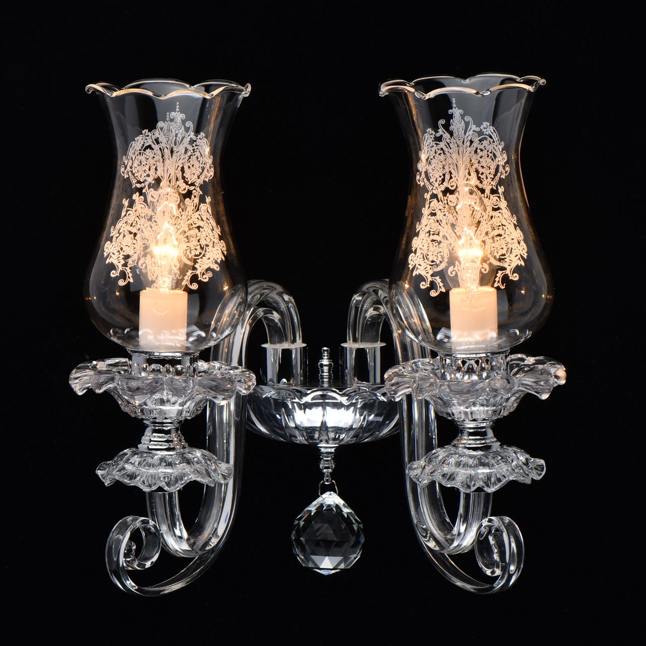 Основание/металл/цвет хрома/прозрачное стекло Плафоны/ стекло/ прозрачное с белым растительным орнаментом Декор/прозрачный хрустальТехнология производства