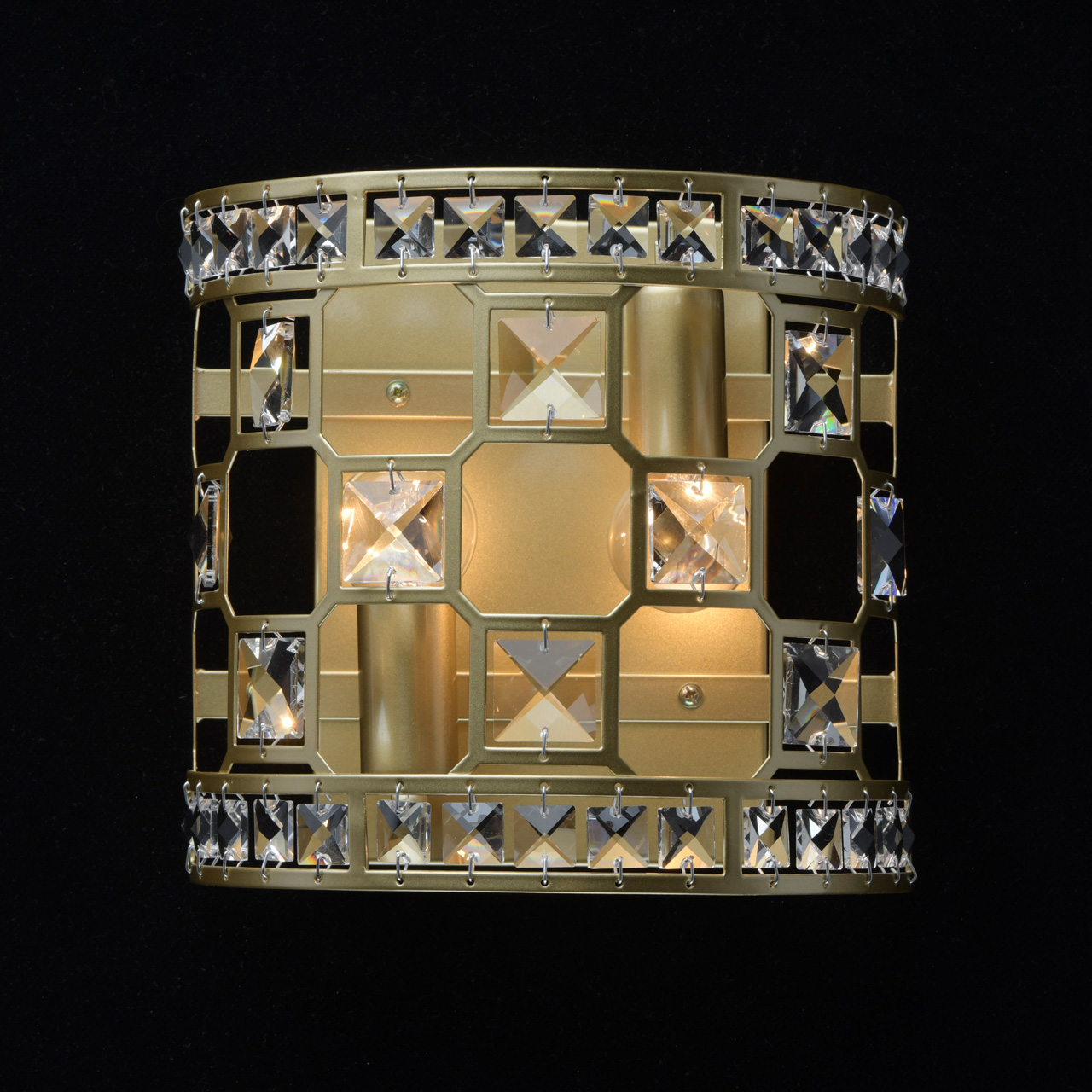 Основание светильника выполнено из металла и окрашено в цвет перламутрового золота. Декоративный плафон выполнен по технологии лазерной резки. Светильник декорирован прозрачным хрусталем квадратной формы.Тип помещения