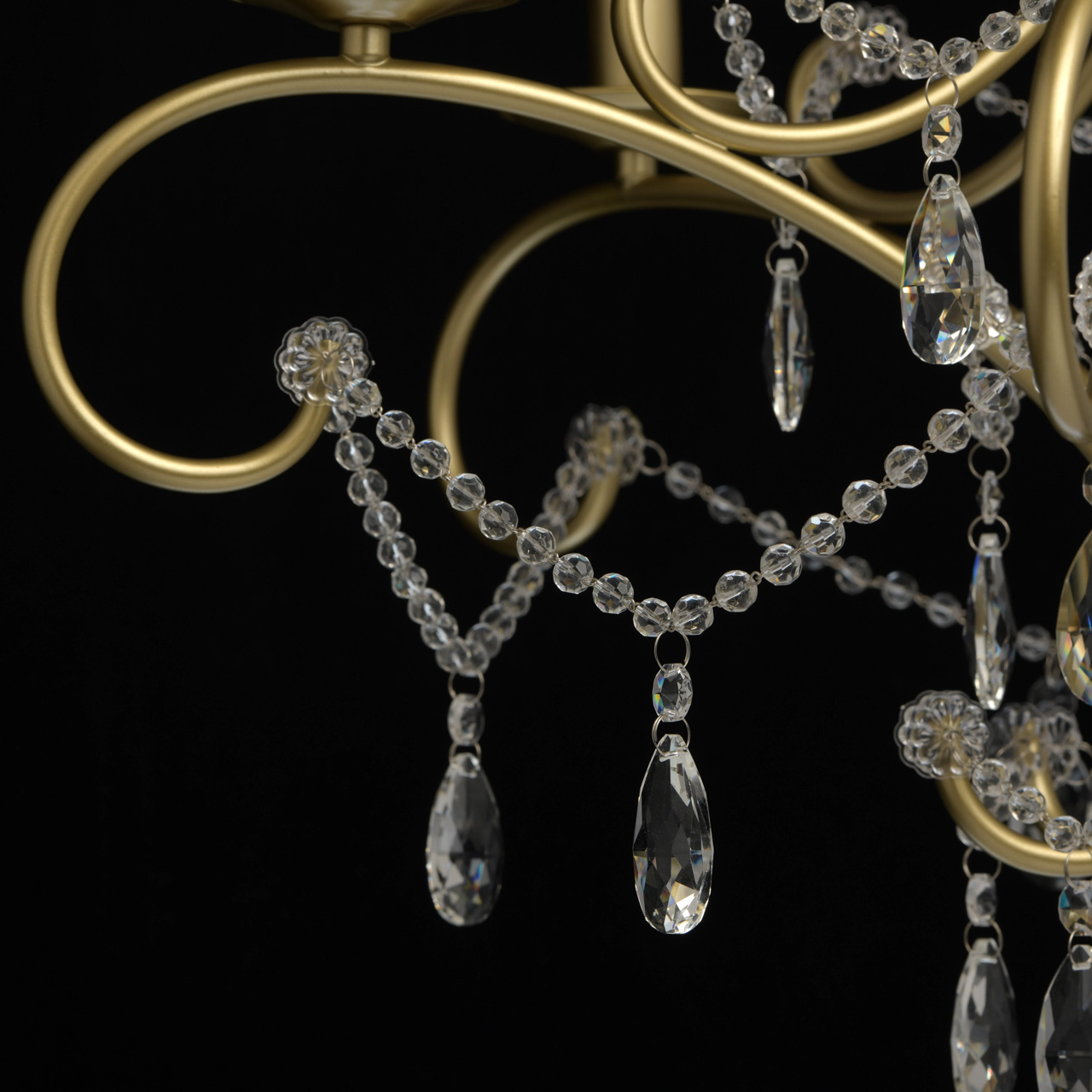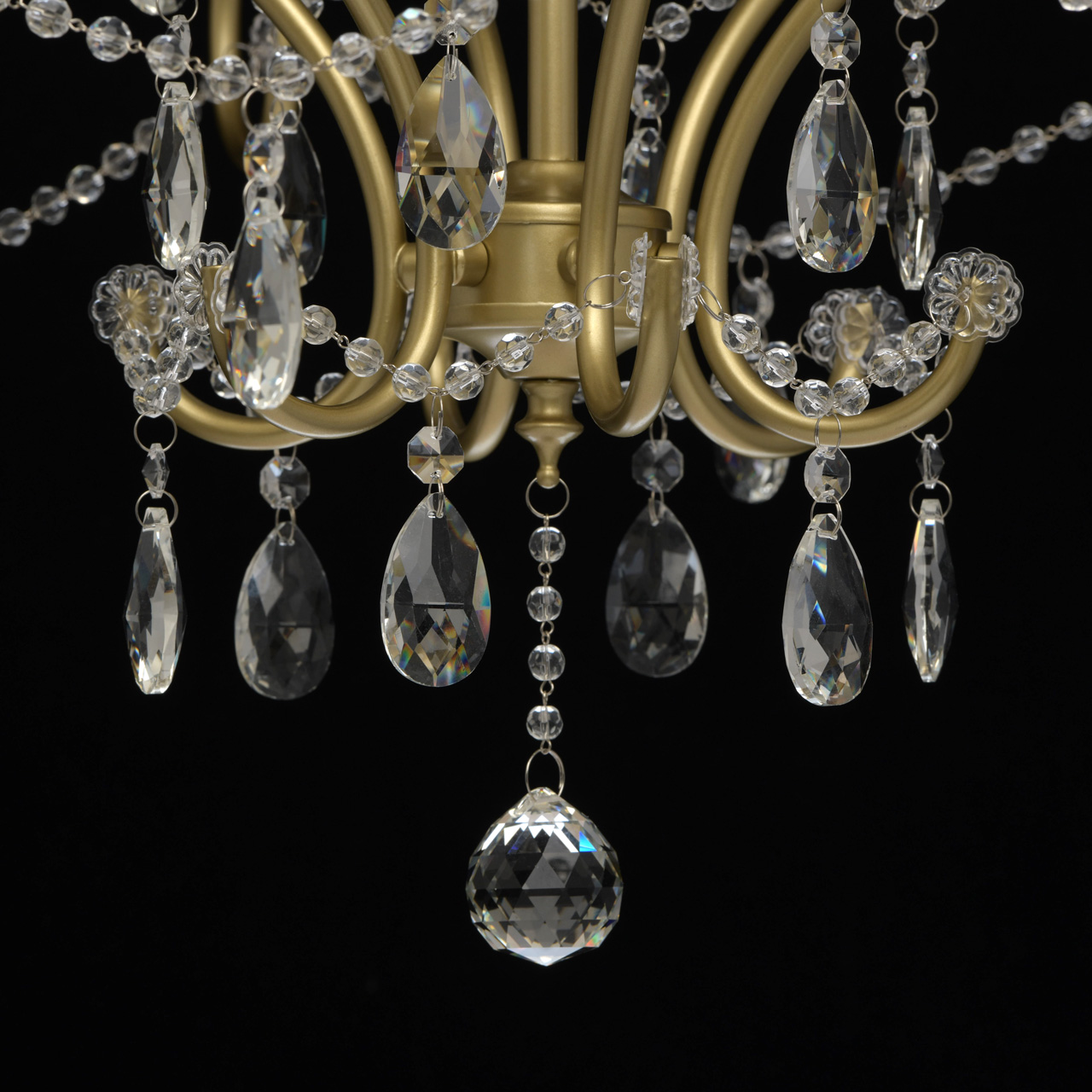 Основание выполнено из сплава металла и гальванизировано в цвет золота. Потолочная чаша, корпус - прессование. Декоративные элементы - прокат на роликовом станке. Декор - прозрачный хрусталь формы шара, октагона, миндаль и декоративные бусины.Тип помещения