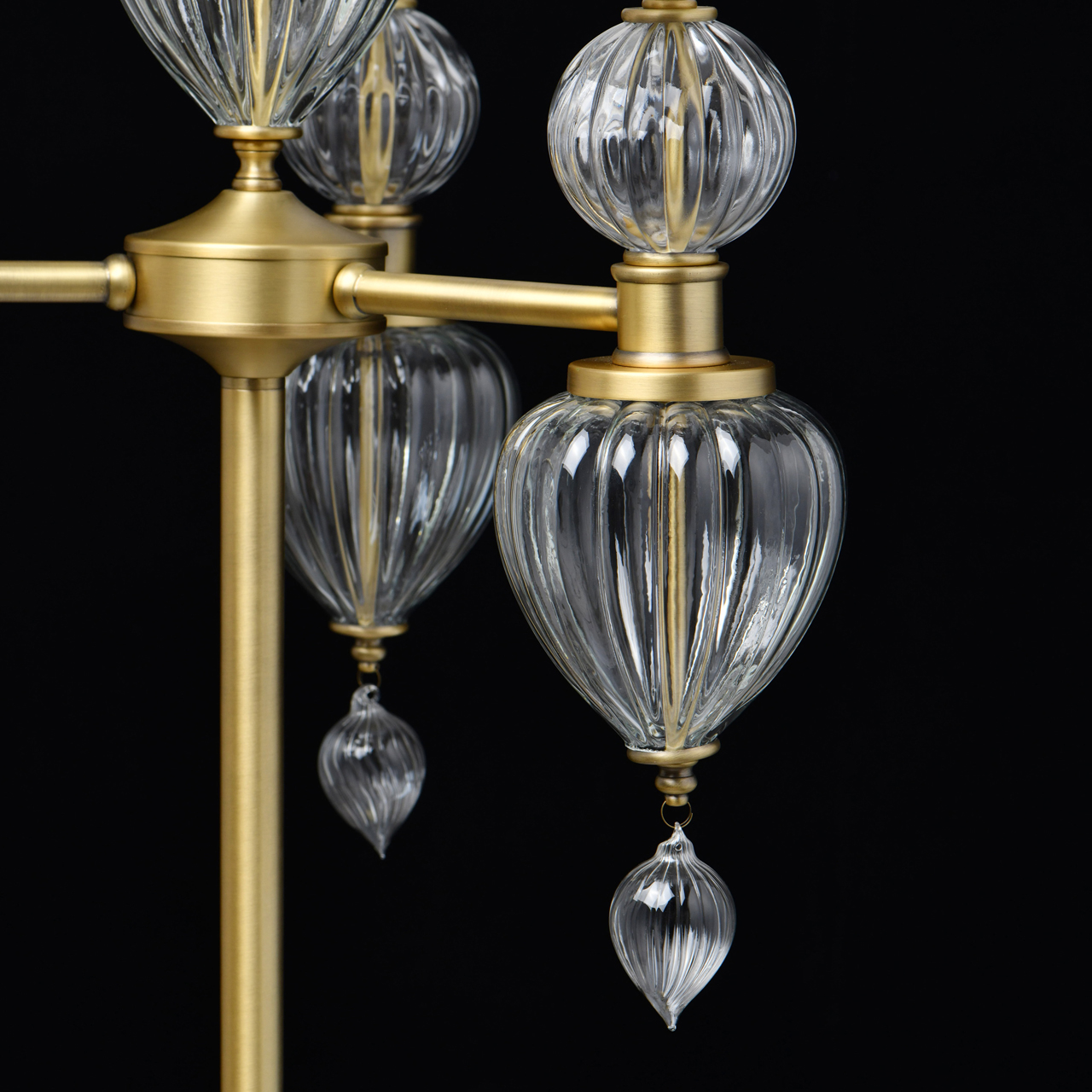 Основание светильника выполнено из металла и гальванизировано в цвет латуни. Светильник декорирован выдувным стеклом ручной работы. Текстильные абажуры белого цвета с термостойким акрилом внутри, отделаны кантом и прошиты.Тип помещения