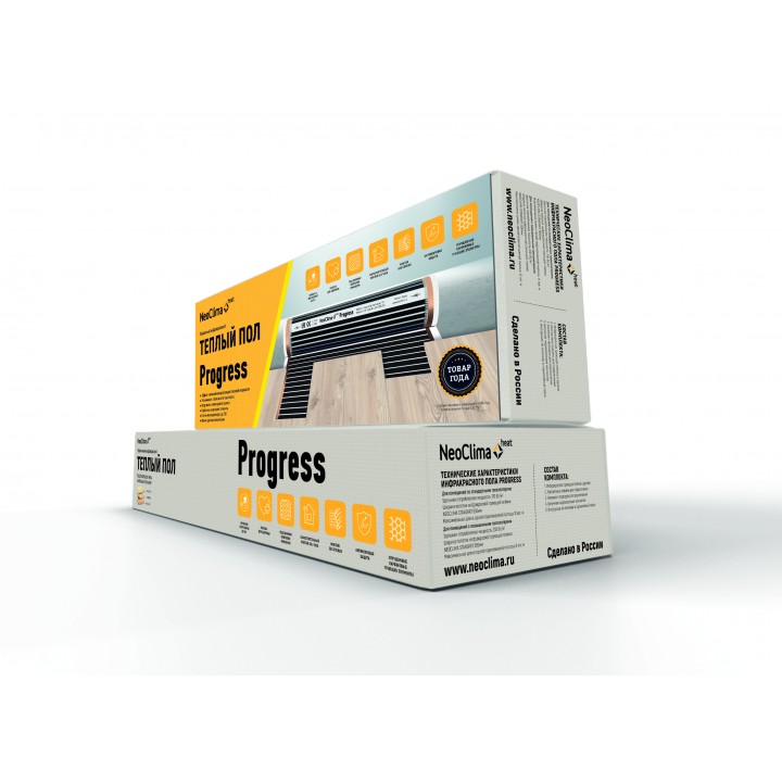 Комплект инфракрасного плёночного тёплого пола NEOCLIMA PROGRESS предназначен для тех потребителей, кто хочет получить высокий уровень комфорта экономя деньги в процессе эксплуатации системы электрического инфракрасного плёночного тёплого пола, поскольку термоплёнка NEOCLIMA PROGRESS в процессе работы снижает энергопотребление до 30%. Комплект, помимо энергосберегающей термоплёнки с серебряной защитой от искрообразования включает в себя всё необходимое для осуществления быстрого и простого монтажа, с которым справится даже домохозяйка – это высококачественные провода для подключения, изготовленные с соблюдением условий ГОСТа, битумно-мастичная электро-гидроизоляция контактов, сертифицированная для герметизации узлов кабельной арматуры, высококачественные контактные зажимы для соединения питающих проводов и медной токопроводящей шины в конструкции системы электрического инфракрасного тёплого пола. Подробная и понятная инструкция пользователя облегчит процесс монтажа под ламинат, линолеум и ковролин. Размерная линейка комплектов NEOCLIMA PROGRESS подобрана с шагом в 0,5 метра и ориентирована на потребности покупателя по организации системы инфракрасного тёплого пола в квартире или в доме (тёплый пол в спальню, тёплый пол в детскую комнату, тёплый пол на балкон или на лоджию, тёплый пол в прихожую, в гостиную)Особенности инфракрасного плёночного тёплого пола NEOCLIMA PROGRESS: