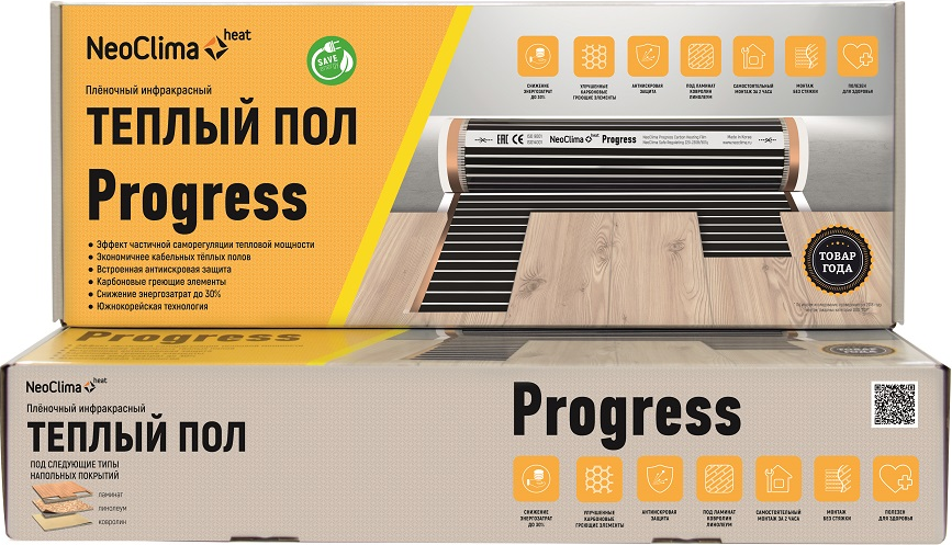 Комплект инфракрасного плёночного тёплого пола NEOCLIMA PROGRESS предназначен для тех потребителей, кто хочет получить высокий уровень комфорта экономя деньги в процессе эксплуатации системы электрического инфракрасного плёночного тёплого пола, поскольку термоплёнка NEOCLIMA PROGRESS в процессе работы снижает энергопотребление до 30%. Комплект, помимо энергосберегающей термоплёнки с серебряной защитой от искрообразования включает в себя всё необходимое для осуществления быстрого и простого монтажа, с которым справится даже домохозяйка – это высококачественные провода для подключения, изготовленные с соблюдением условий ГОСТа, битумно-мастичная электро-гидроизоляция контактов, сертифицированная для герметизации узлов кабельной арматуры, высококачественные контактные зажимы для соединения питающих проводов и медной токопроводящей шины в конструкции системы электрического инфракрасного тёплого пола. Подробная и понятная инструкция пользователя облегчит процесс монтажа под ламинат, линолеум и ковролин. Размерная линейка комплектов NEOCLIMA PROGRESS подобрана с шагом в 0,5 метра и ориентирована на потребности покупателя по организации системы инфракрасного тёплого пола в квартире или в доме (тёплый пол в спальню, тёплый пол в детскую комнату, тёплый пол на балкон или на лоджию, тёплый пол в прихожую, в гостиную)Эффект саморегуляции, при нагреве сбрасывает потребляемую мощность на 30%!. Серебряная антиискровая защита в конструкции термоплёнки