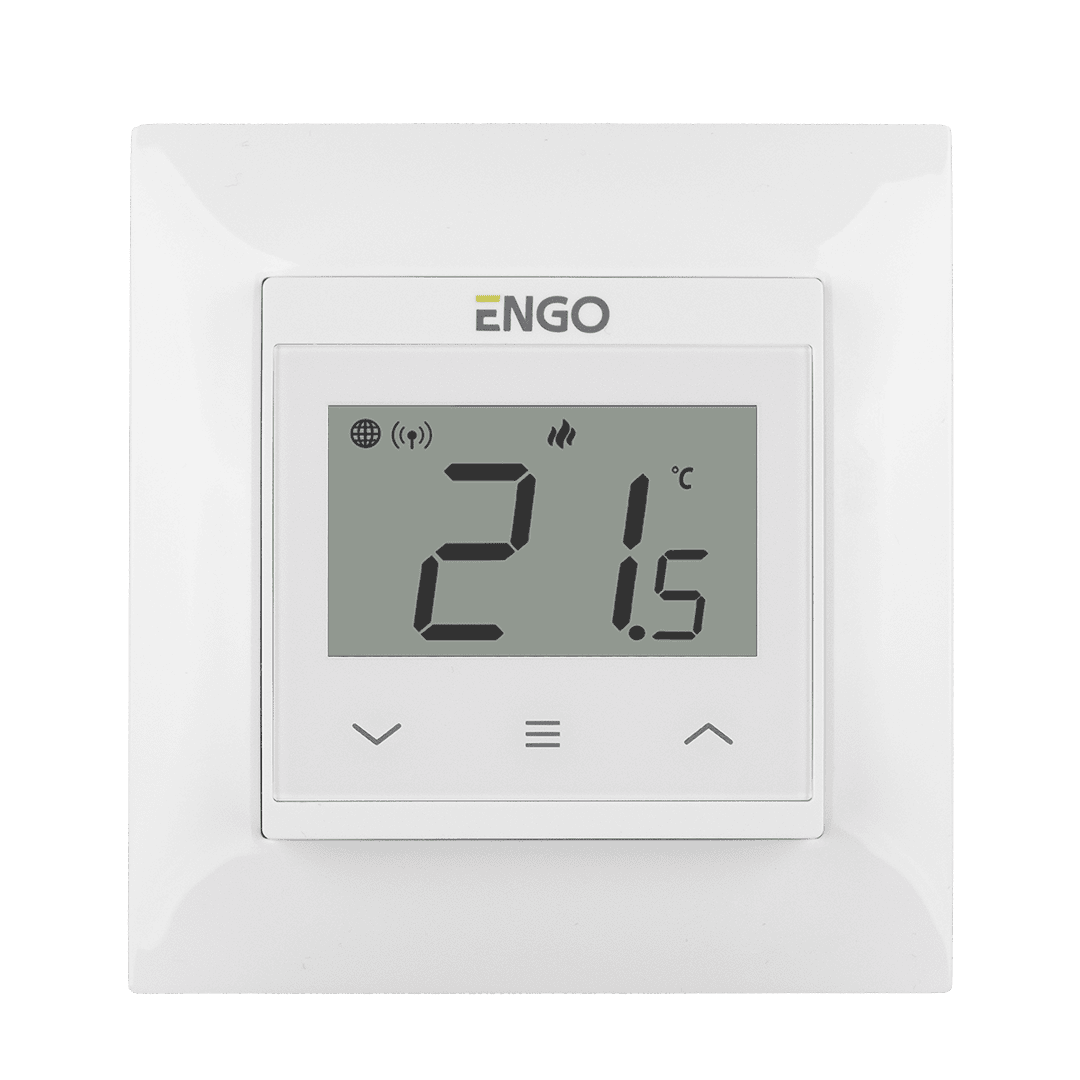 Терморегулятор с возможностью подключения датчика тёплого пола. Контролирует климат с использованием новейших технологий. Питание 220 В, скрытого монтажа. Программируется и управляется в приложении ENGO Smart. Предназначен для установки в рамку размером 55 x 55 мм.Характеристики продукта